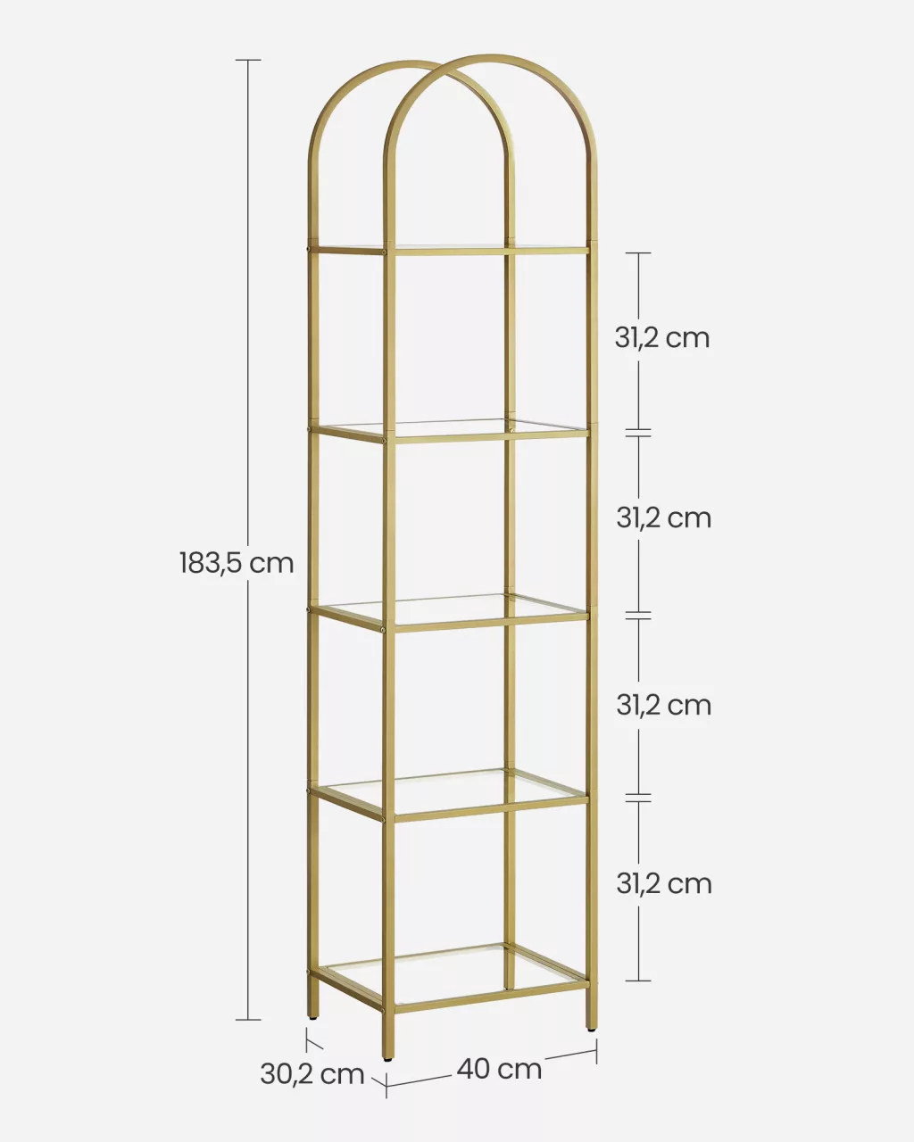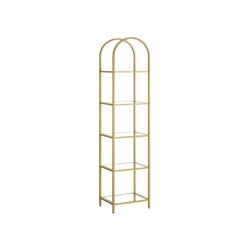 Polc, 5 szintes, ívelt üvegpolc, fém szerkezet, arany és átlátszó, 40 x 30 x 183 cm