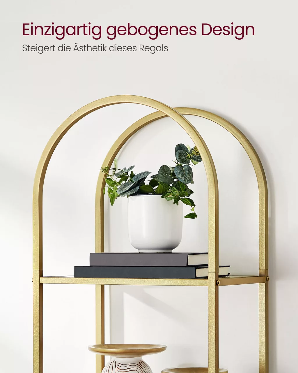 Ez a lenyűgöző, 5 szintes ívelt üvegpolc tökéletes választás minden otthonba, ahol a stílus és a funkcionalitás találkozik. Az arany színű fém szerkezet és az átlátszó üvegpolcok eleganciát és modern megjelenést kölcsönöznek bármely helyiségnek. Az alábbi előnyöket élvezheti, ha ezt a polcot választja: