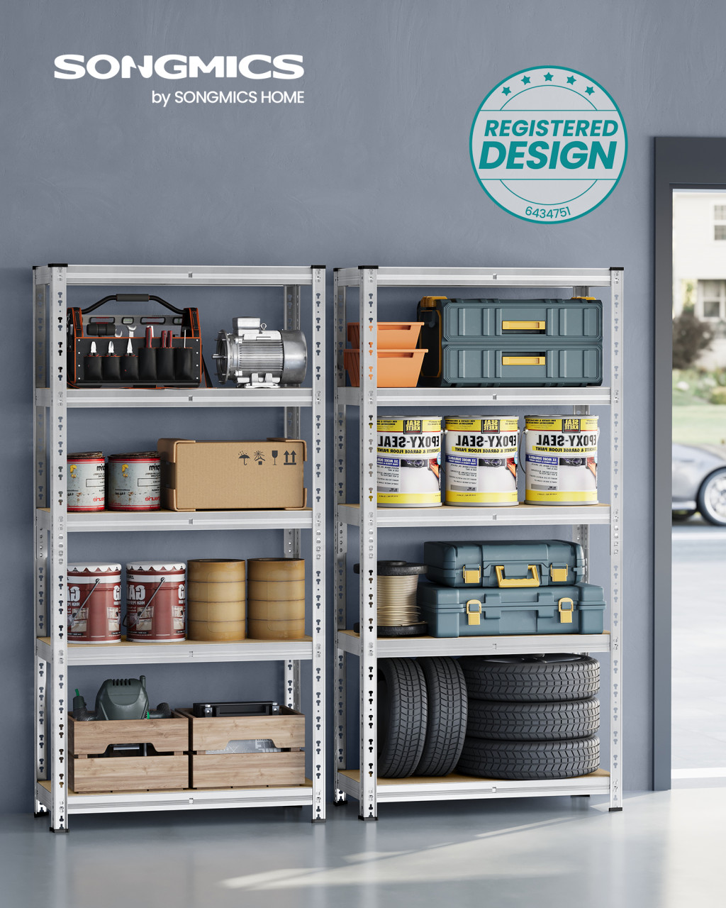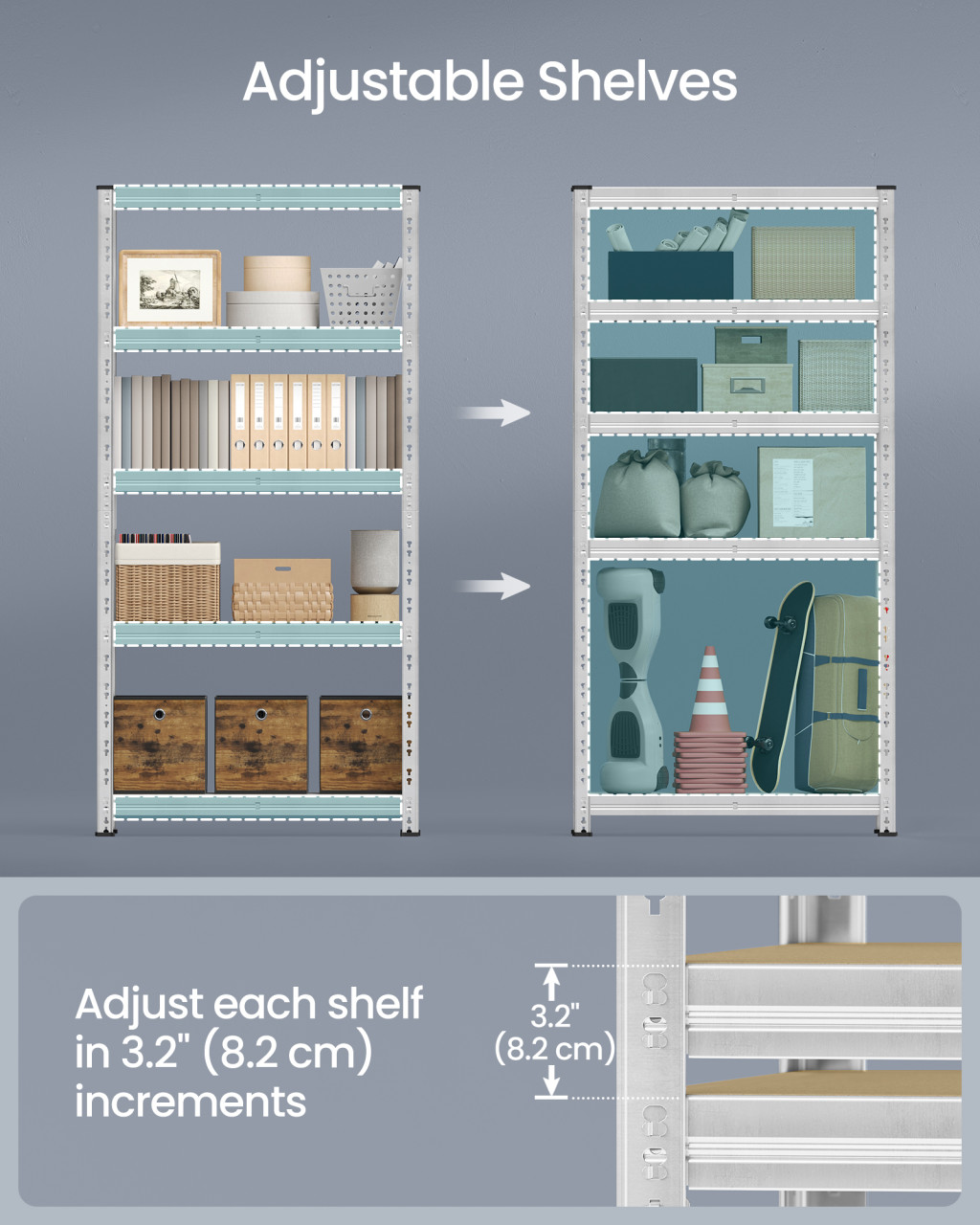 • Állítható polcok: Minden polc 8,2 cm-es lépésekben állítható, így könnyedén rendezheti a különböző méretű tárgyakat, legyenek azok tárolódobozok vagy sportfelszerelések.