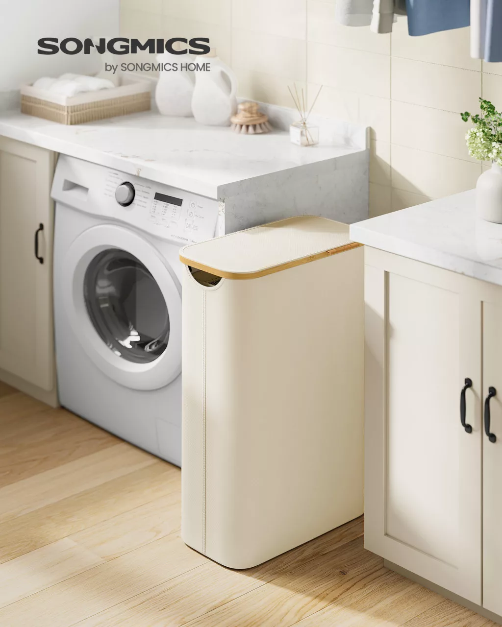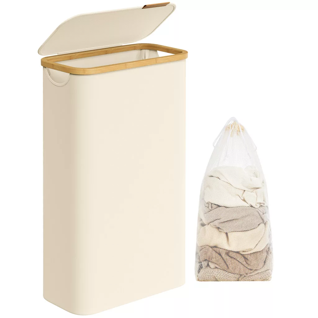 Slim szennyestartó, 65L, bambusz fogantyúkkal, összecsukható, krémfehér