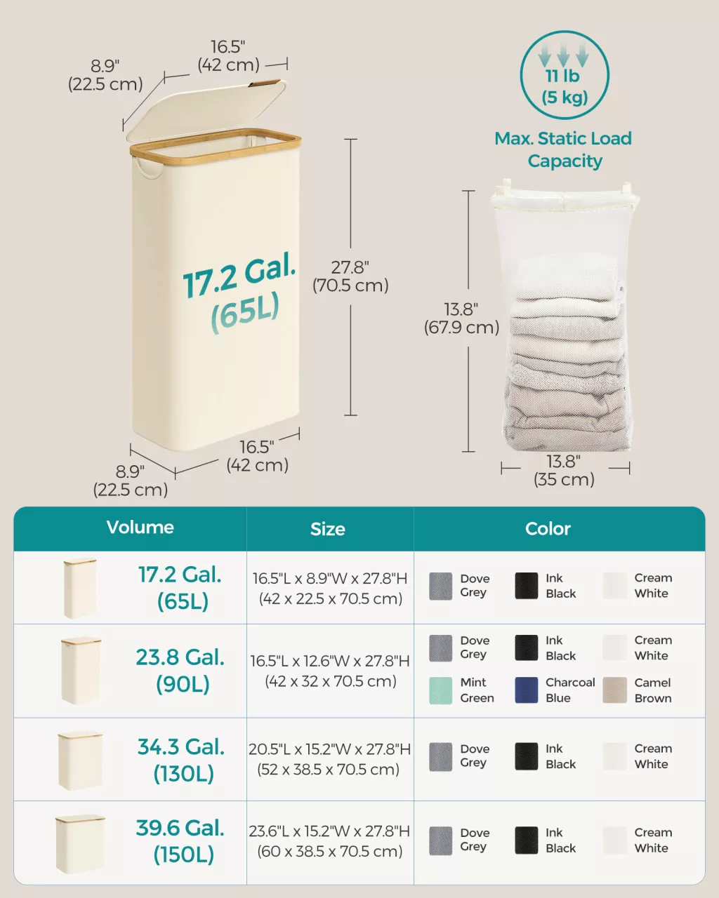 A Slim szennyestartó, 65L kapacitással, ideális megoldás a kis lakások és kompakt mosók számára. A krémfehér szín és a bambusz fogantyúk eleganciát kölcsönöznek a terméknek, miközben praktikus funkciókkal rendelkezik. Az alábbi előnyöket élvezheti, ha ezt a szennyestartót választja: