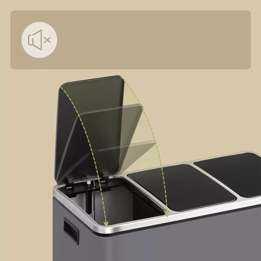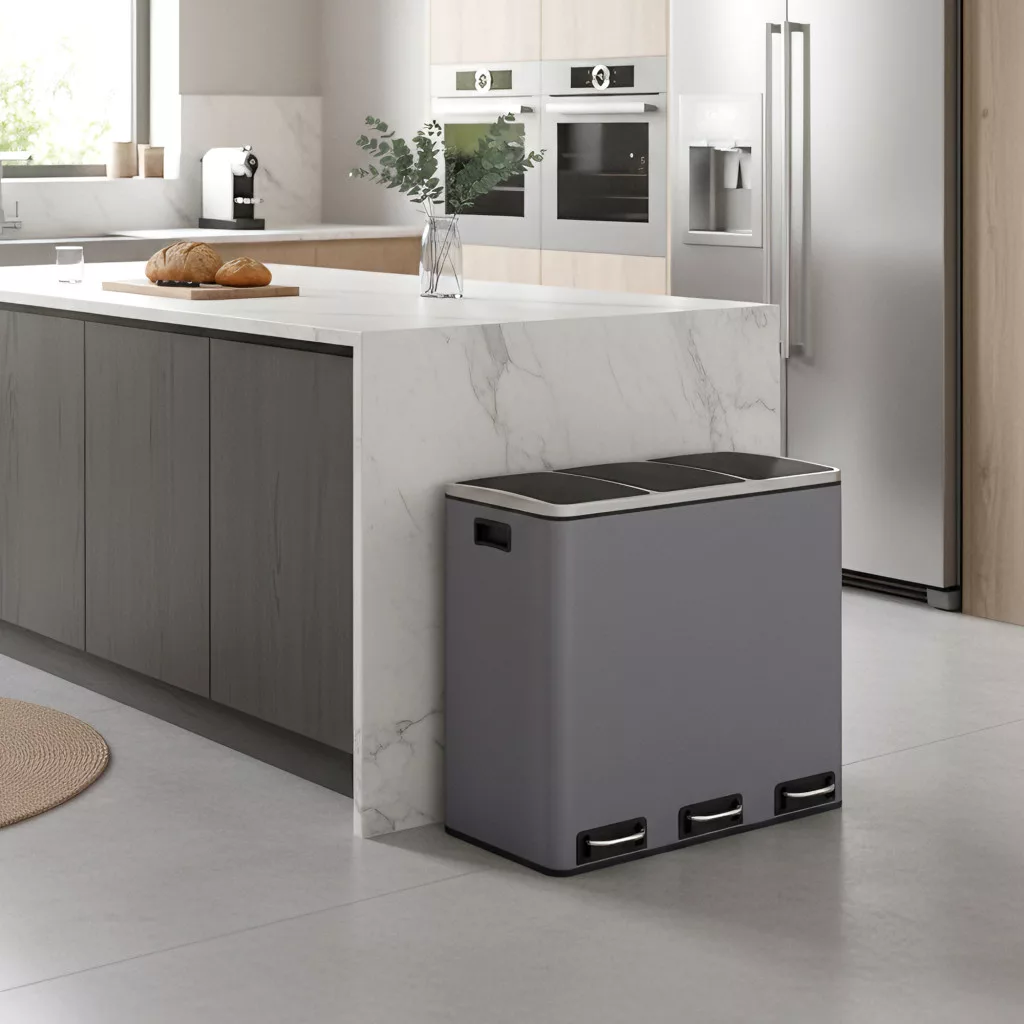 Ez a szelektív szemeteskuka ideális megoldás a környezettudatos háztartások számára. A három különálló, 18 literes rekesz lehetővé teszi a hulladék egyszerű és hatékony szétválasztását, így a csomagolási hulladék, az organikus hulladék és a maradék hulladék könnyen kezelhető. A modern dizájn és a matt szürke szín tökéletesen illeszkedik bármilyen konyhai környezetbe, így nemcsak praktikus, hanem esztétikus választás is.