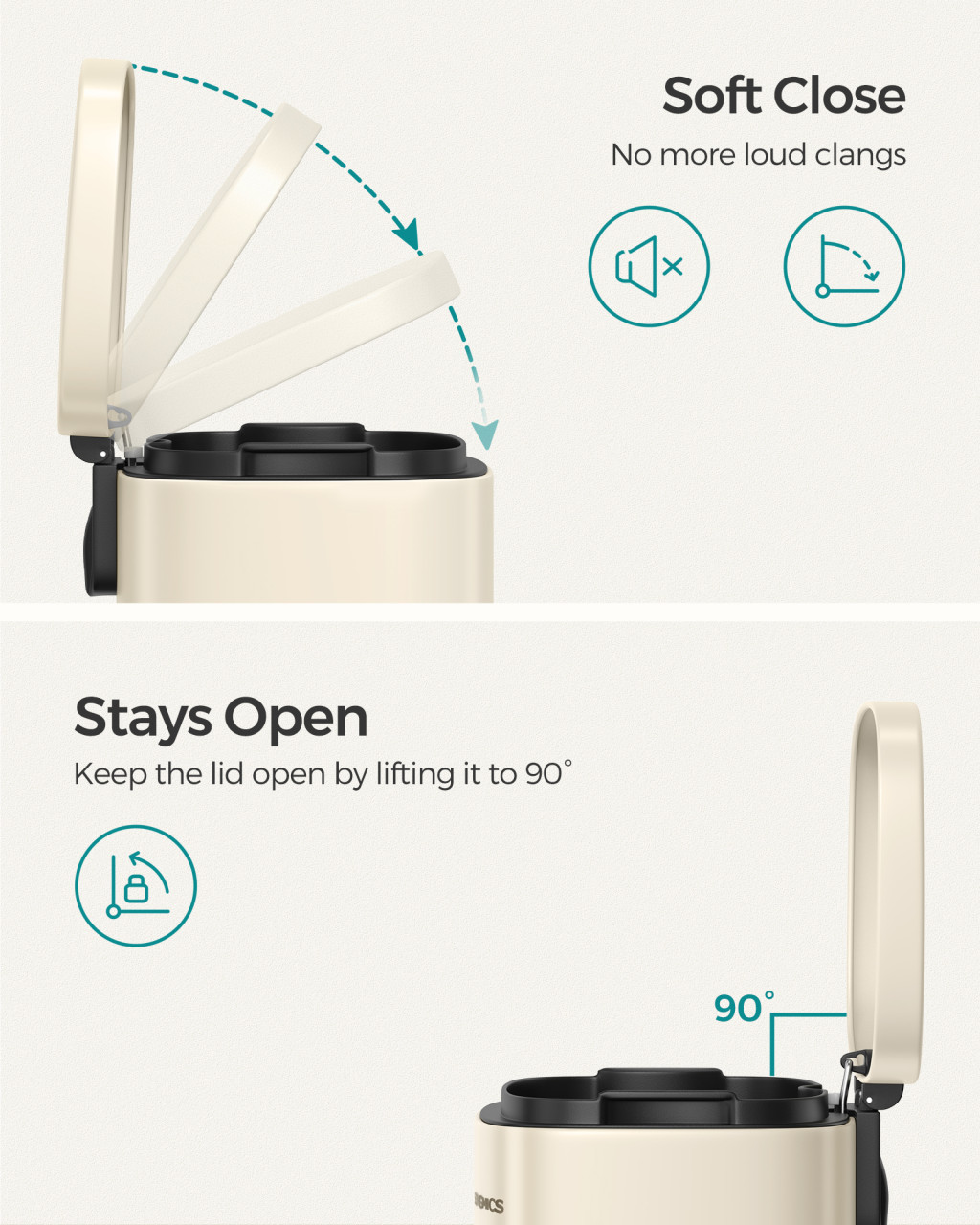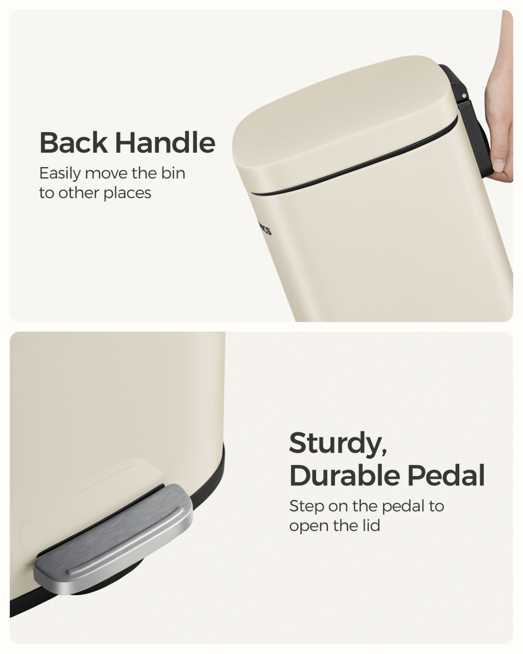 • Praktikus funkciók: Az belső vödör kialakítás segít a szemeteszsákok biztonságos rögzítésében, míg a hátsó fogantyúval könnyen mozgatható.