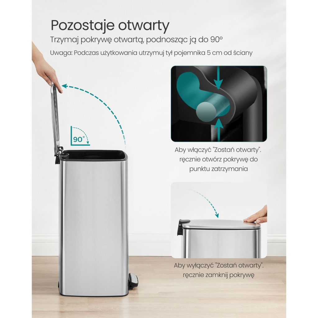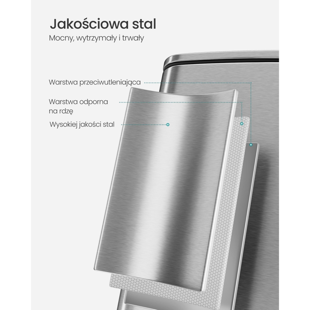 • Stabilitás: Az alján található csúszásmentes párnák biztosítják a szemetes stabilitását, így elkerülhető a felborulás, és a tér mindig rendezett marad.