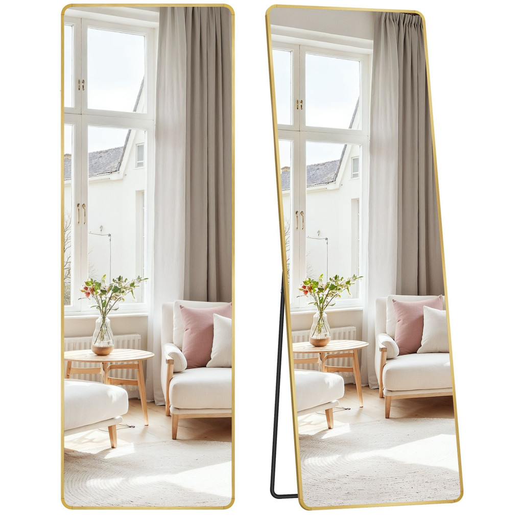 Teljes hosszúságú tükör, téglalap, állványos, alumínium keret, világos arany