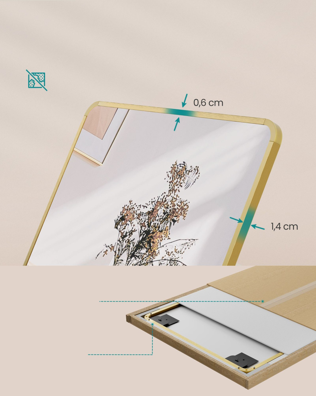 • Stílusos dizájn: A világos arany alumínium keret eleganciát ad bármely helyiségnek, legyen az hálószoba, előszoba, nappali vagy otthoni edzőterem.