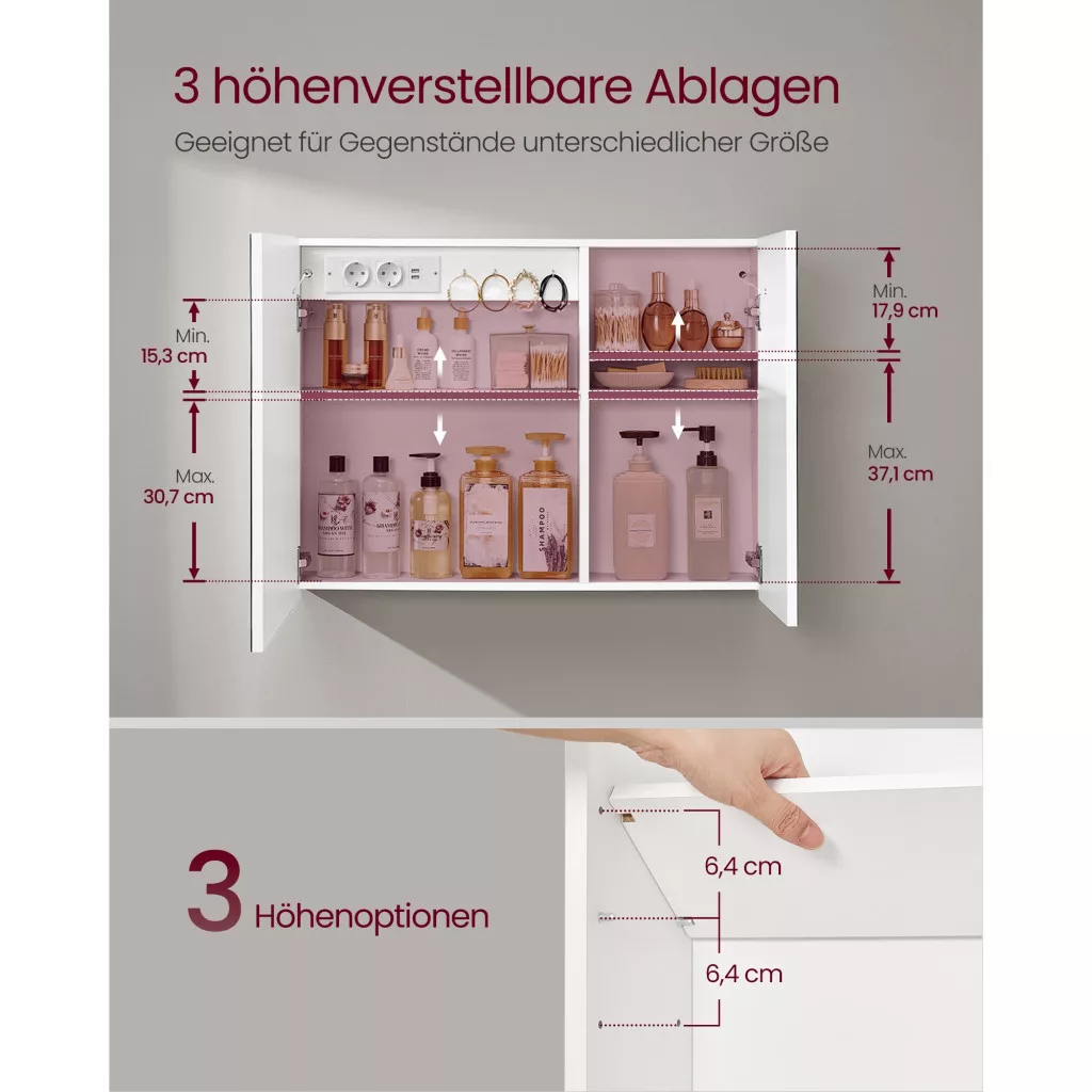• Praktikus tárolás: A tükör mögött rejtett tárolóhely található, ahol 4 állítható polc segít a különböző méretű tárgyak rendezett tárolásában.