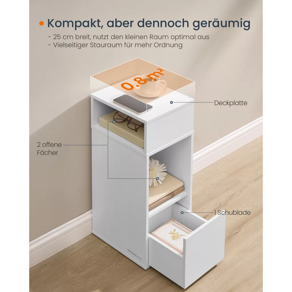 A vékony éjjeli szekrény tökéletes megoldás a kis helyek kihasználására. A modern dizájn és a praktikus tárolási lehetőségek révén ideális választás minden hálószobához vagy nappalihoz. Az alábbi előnyöket élvezheti, ha ezt a terméket választja: