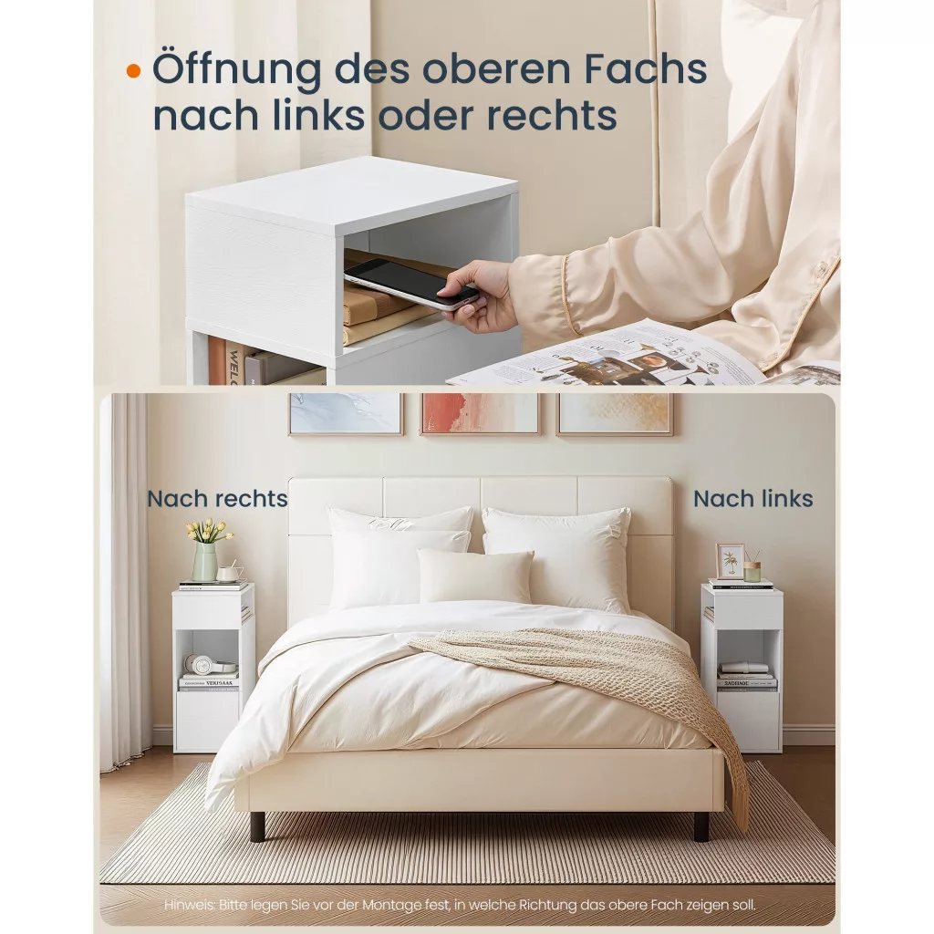 • Rugalmas elhelyezés: A felső nyitott rekesz balra vagy jobbra is szerelhető, így alkalmazkodik a szoba elrendezéséhez.