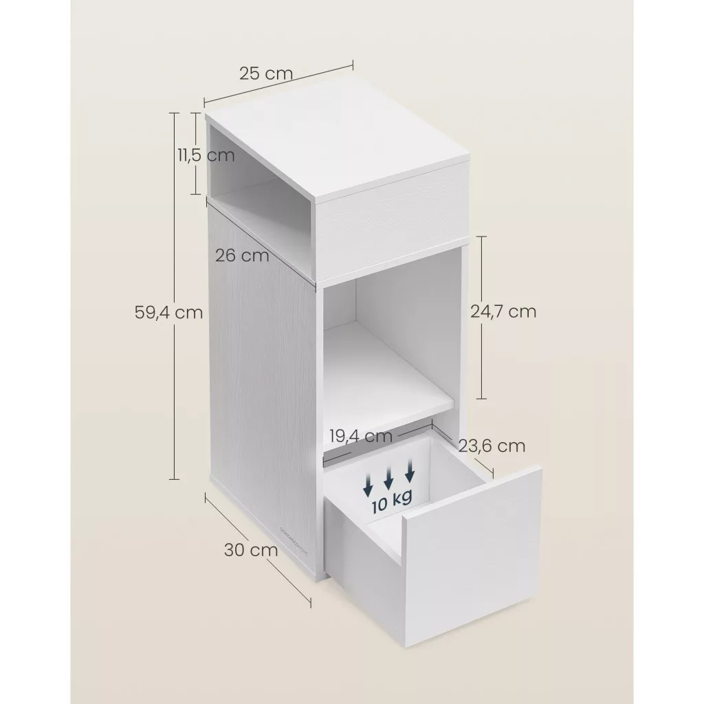 A szekrény színe hófehér, anyaga MDF és forgácslap, így nemcsak esztétikus, hanem környezetbarát is. A termék mérete 30 x 25 x 59.4 cm, súlya 7.3 kg, míg a fiók maximális terhelhetősége 10 kg. Az FSC-minősítéssel rendelkező faanyag biztosítja, hogy a termék fenntartható forrásból származik.