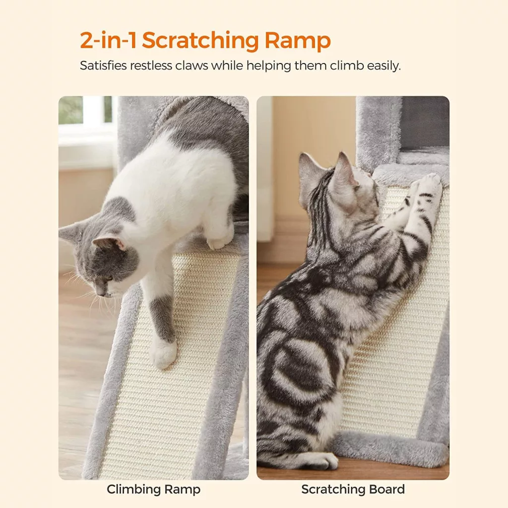 2 az 1-ben Kaparó Rámpa: Egy kaparódeszkával és egy létrával egyben, ez a macskakaparó nemcsak lehetővé teszi, hogy macskáid kedvükre kaparjanak anélkül, hogy tönkretennék a kanapédat, hanem segít a kiscicáknak, idős macskáknak és még a mozgáskorlátozott macskáknak is könnyedén felmászni.