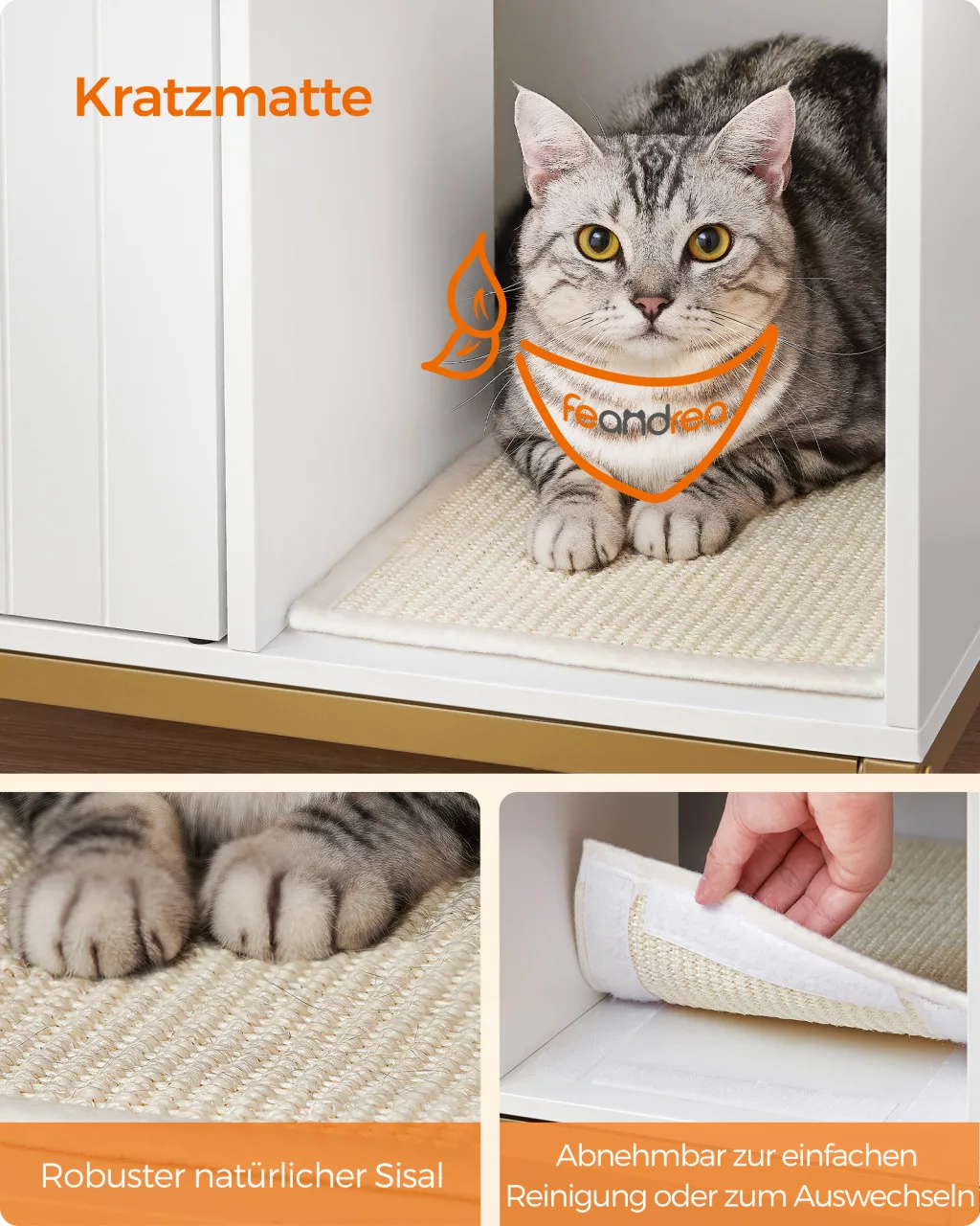 Feandrea macskaalom doboz burkolat, rejtett alomtálca bútor kaparószőnyeggel, magas lábakkal,