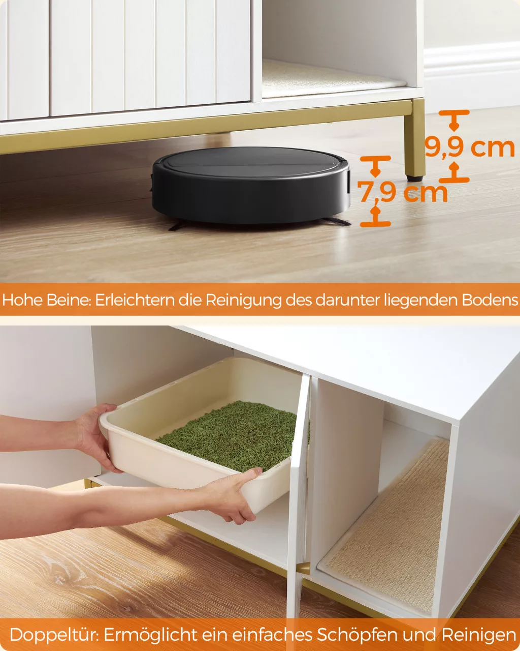 [Díszítse otthonát] Fehér felületével és aranyszínű fémvázzal ez a modern alomtálca burkolat könnyedén illeszkedik a legtöbb lakberendezési stílushoz, így a korábban kellemetlen alomtálca területet esztétikus hellyé varázsolja