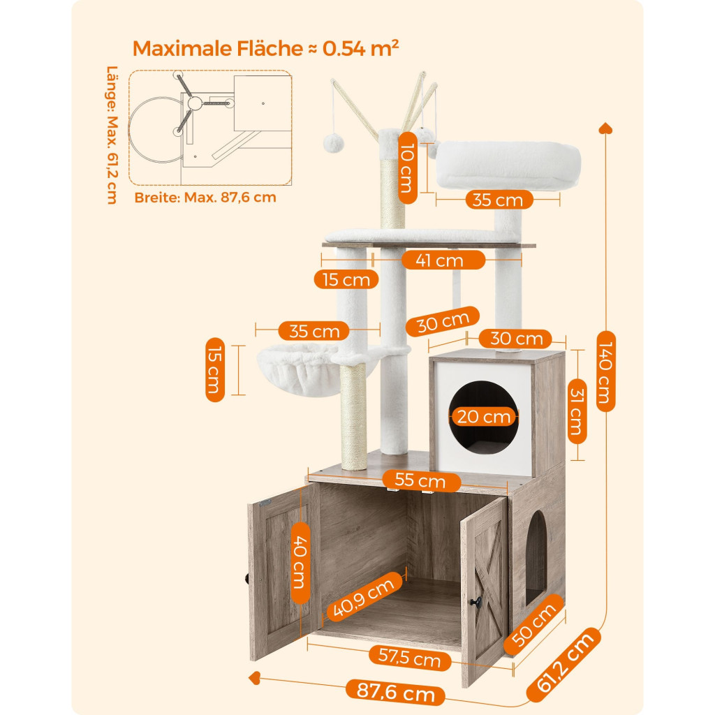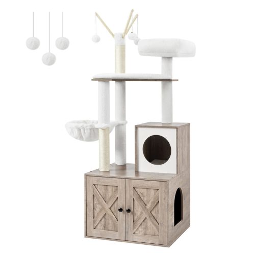 FEANDREA Macska kaparófa, cicaházzal és alomtálca tartóval, szürkés barna 58×50×140cm