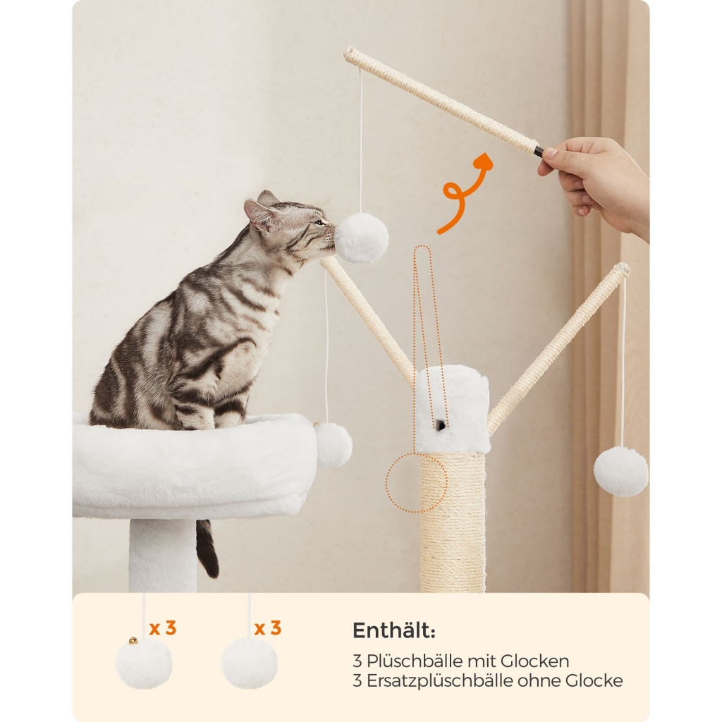 Korlátlan szórakozás és kényelem: 3 levehető plüss labdás rúd, szizáloszlopok, jól párnázott felső platform, ölelgetős macskabarlang és bolyhos alvóhely - ezzel a kaparófával macskái nem fognak unatkozni