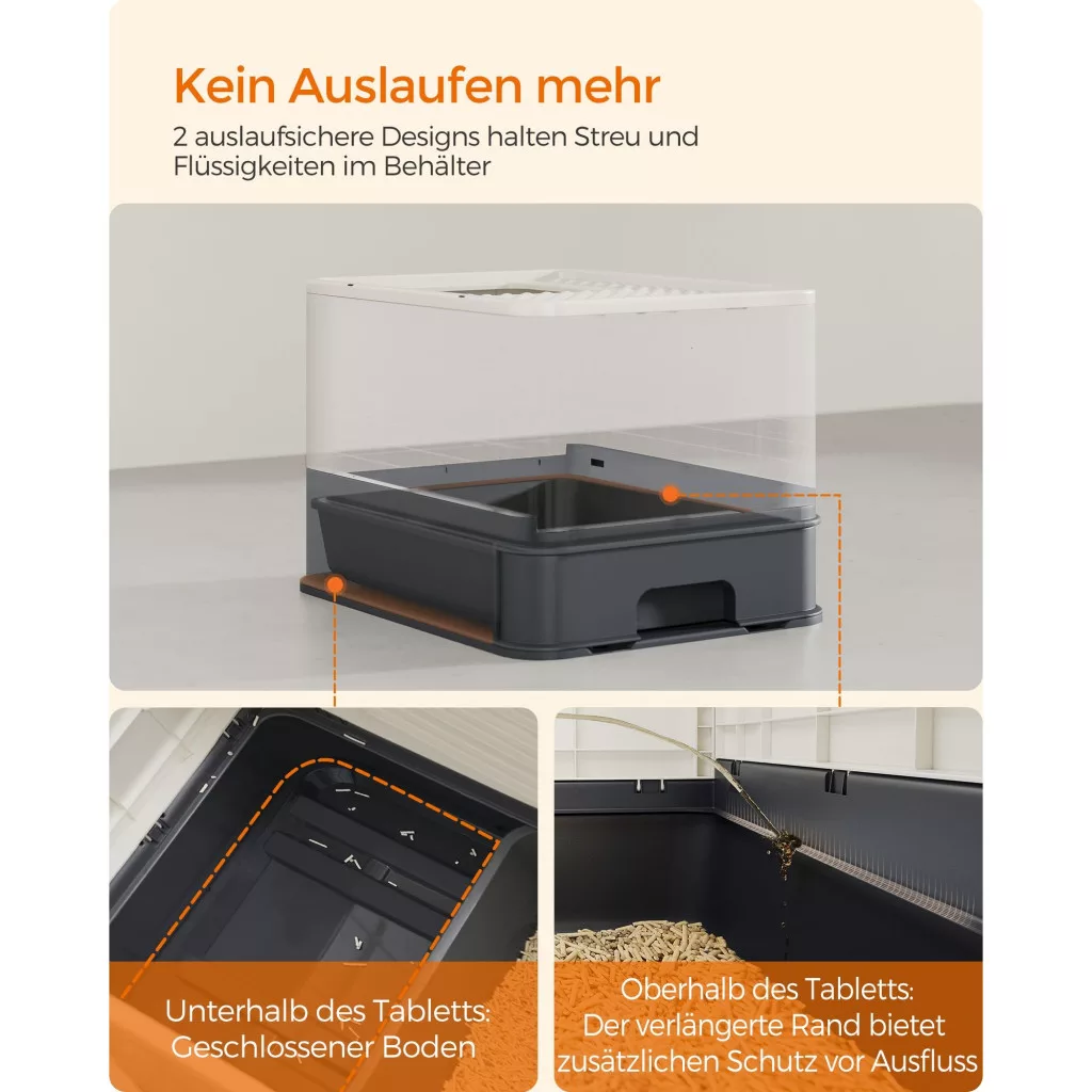 Nincs szivárgás: A peremek és a zárt alj megakadályozzák, hogy az alom vagy a vizelet a padlóra kerüljön. Ez a zseniális kialakítás különösen hasznos lesz, ha macskája szeret ásni vagy állva pisilni!