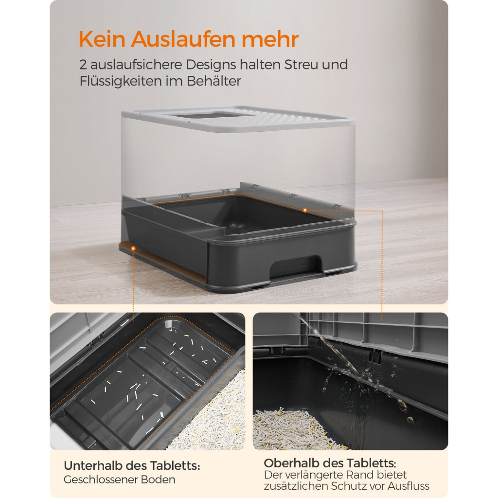 Nincs szivárgás: A tálca felett egy meghosszabbított perem és alul egy zárt alsó rész található. Ez a két szivárgásgátló kialakítás együtt megakadályozza, hogy az alom vagy a vizelet a padlóra kerüljön. Igazi életmentő, ha a macskája szeret ásni vagy állva pisilni!
