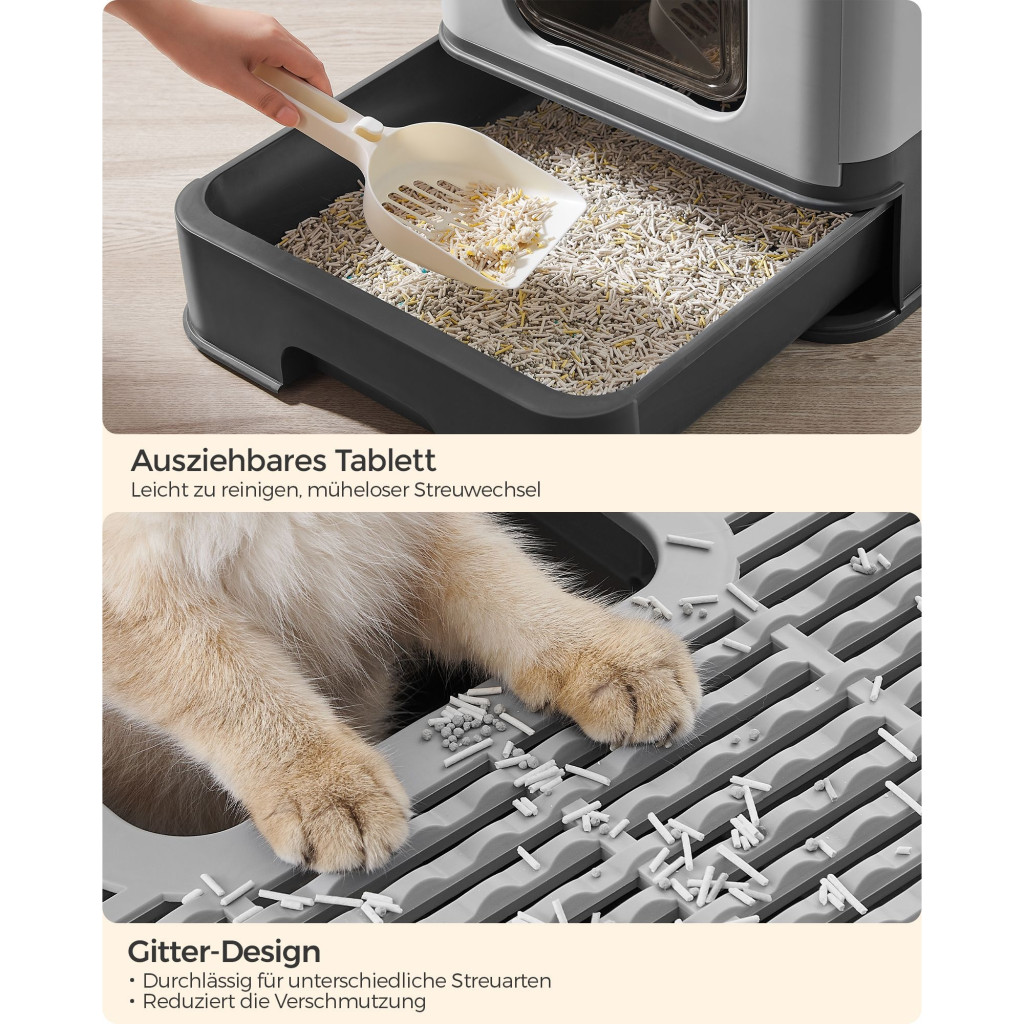 Könnyen csúsztatható, könnyen tisztítható: Ez a fedett macskaalomdoboz kihúzható tálcával rendelkezik, ami megkönnyíti az alom tisztítását vagy cseréjét. Egy lapát és egy kefe is tartozik hozzá, hogy segítsen az ürülék összegyűjtésében és az alom tisztításában a tetején vagy a sarkokban.
