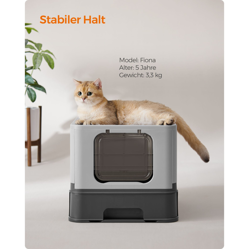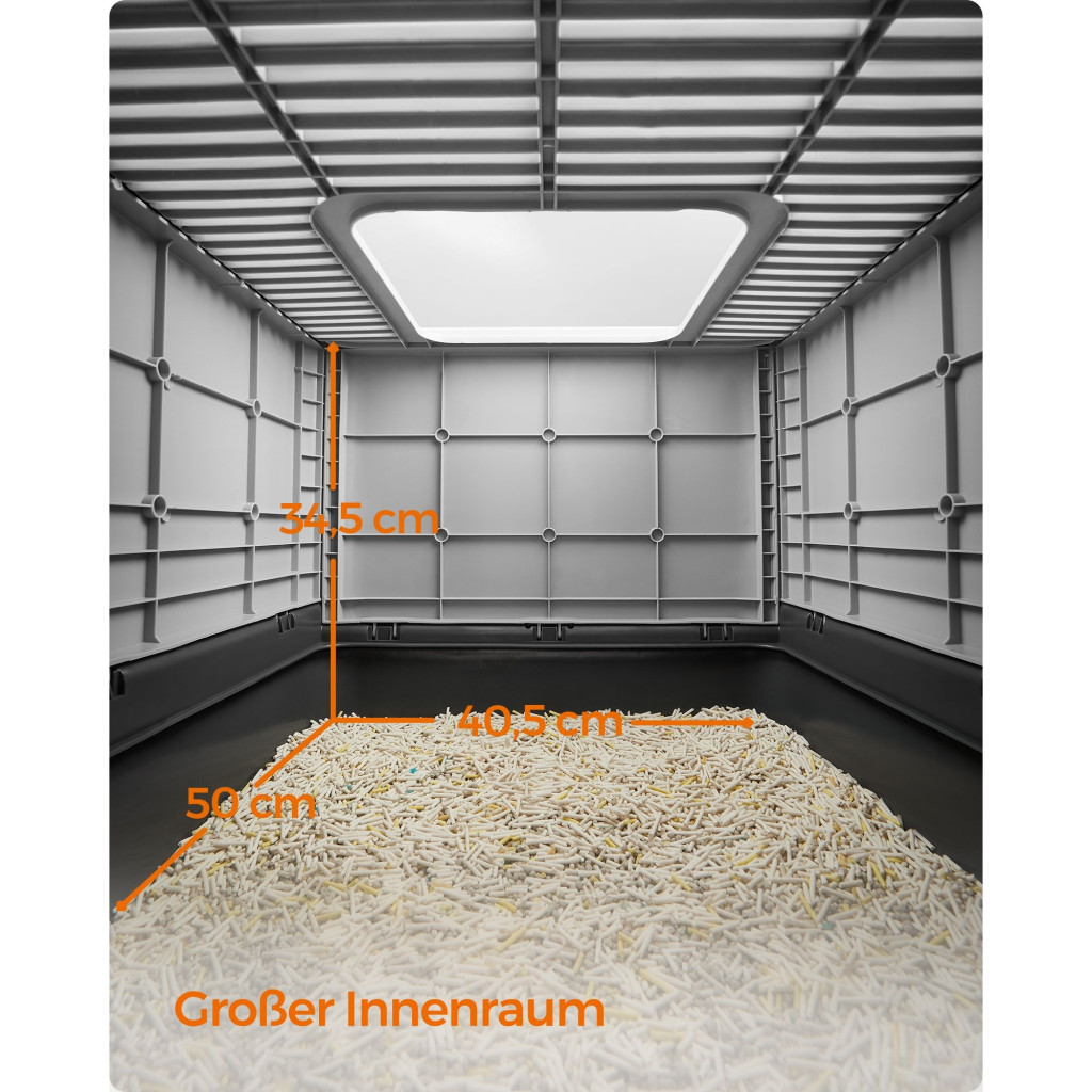 Nagyobb vagy kövér macskákhoz is illik: A zárt alomdoboz belső mérete 50 x 40,5 x 34,5 cm, ami tágas helyet biztosít még a nagyobb macskáknak is. És mi a helyzet a tetejével? Ne aggódjon, akár 15 kg-ot is elbír.
