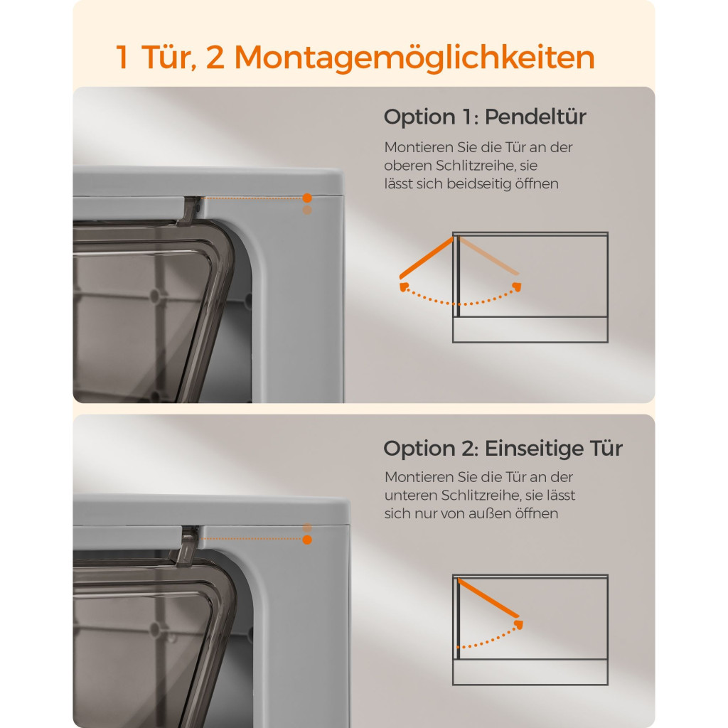 1 ajtó, 2 használati mód: Az ajtót egyirányú bejárattá teheti, és a macska a felső nyíláson keresztül jöhet ki, vagy lengőajtóvá alakíthatja, hogy szabadon jöhessen és mehessen – az ajtót igény szerint szerelheti fel. Vagy, ha a macskája kezdő, eltávolíthatja az ajtót, hogy megkönnyítse a használatot.