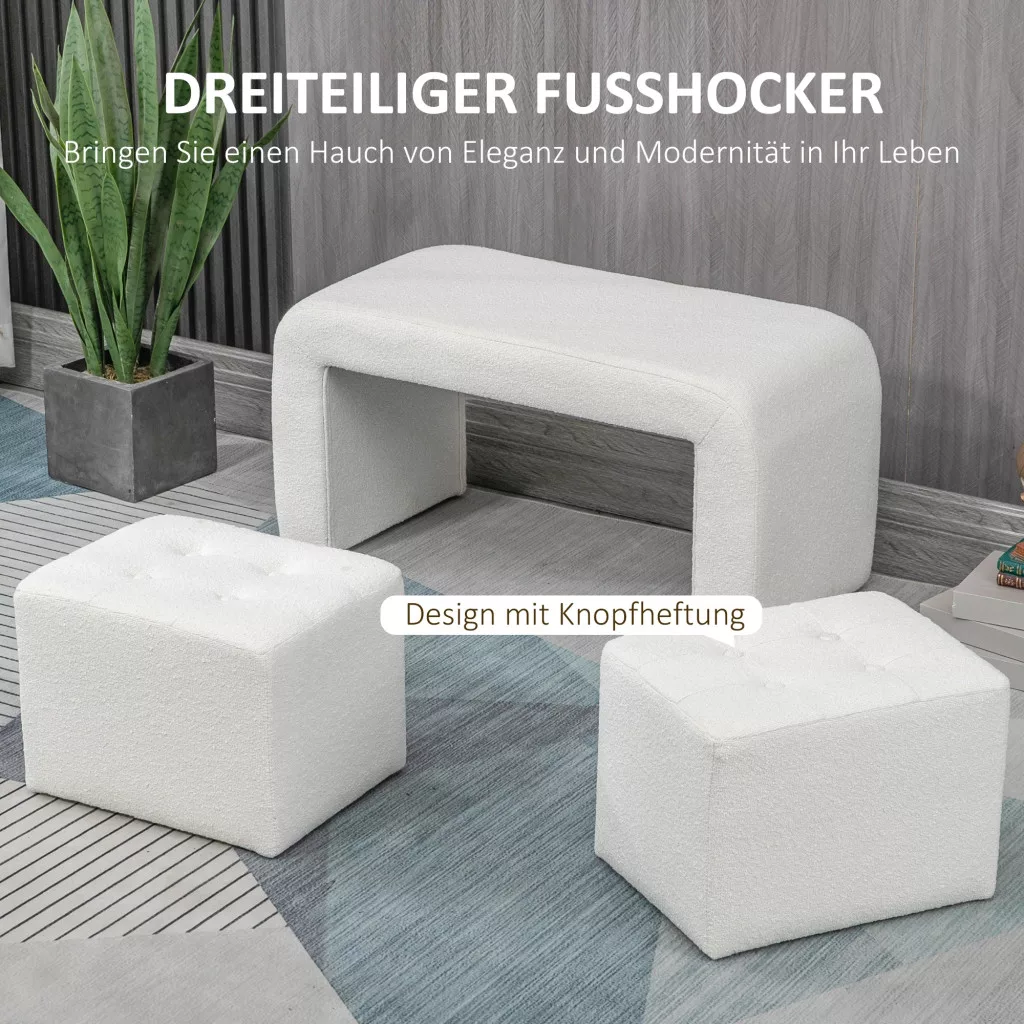 A HOMCOM 3 darabos lábzsámoly szettje további ülőhelyeket biztosít, és stílusos akcentusdarabokat ad otthonodhoz. Az elegáns fehér szín és a lenyűgöző gombos kárpitozás révén könnyedén illeszkedik bármilyen berendezési stílushoz, és fokozza a lakótér eleganciáját és modernitását. A HOMCOM-mal otthonodat hívogatóvá varázsolhatod.