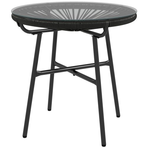 • Szilárd felépítés: A kerti asztal porszórt felületű robusztus fémvázból, edzett üvegből és PE-rattan szegélyből áll. Az anyag masszív és tartós