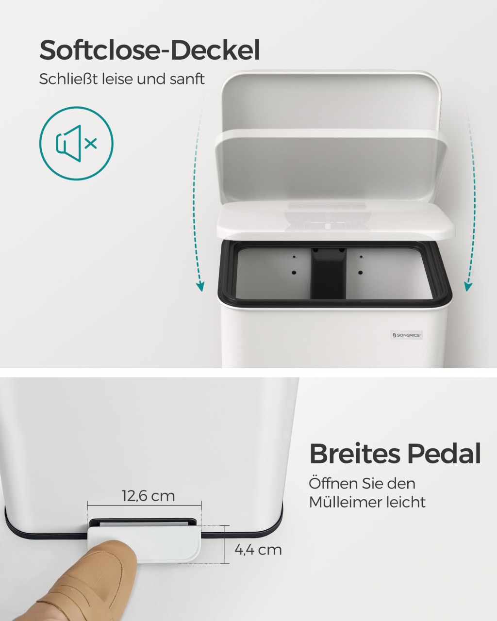 SONGMICS Pedálos szemeteskuka 40L, fehér, 15 szemeteszsákkal