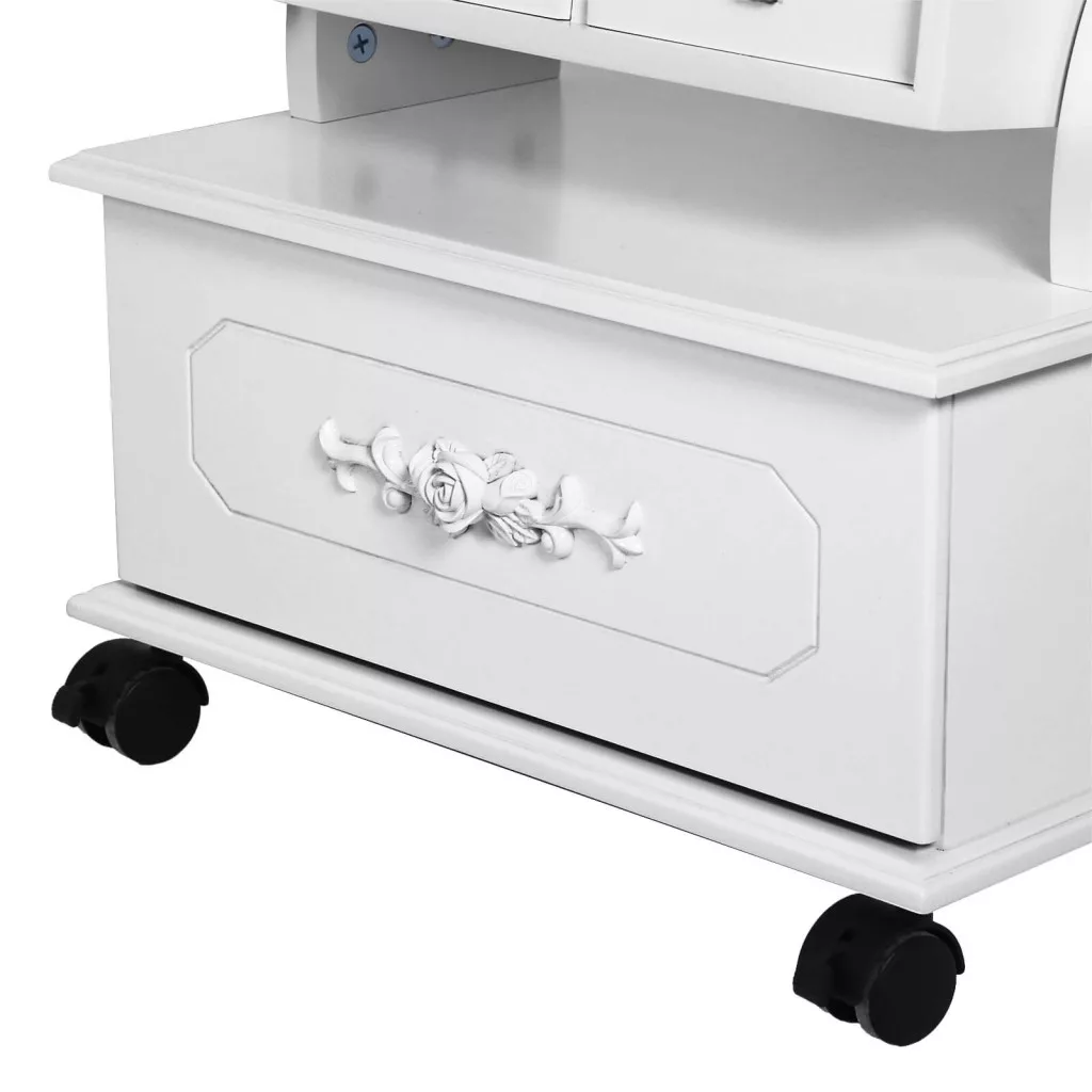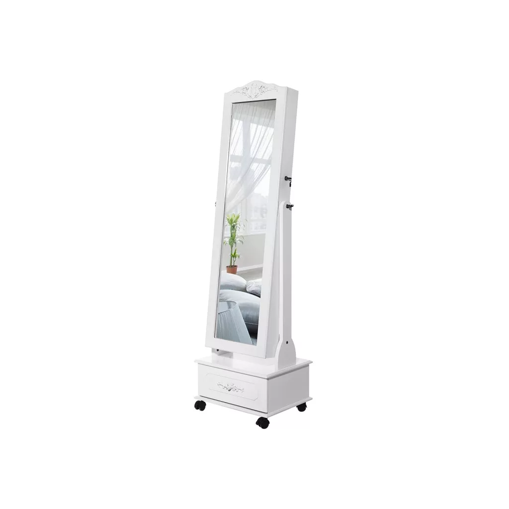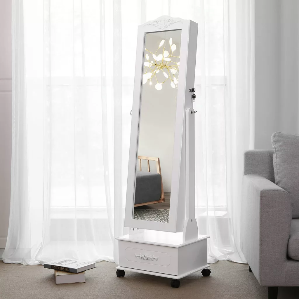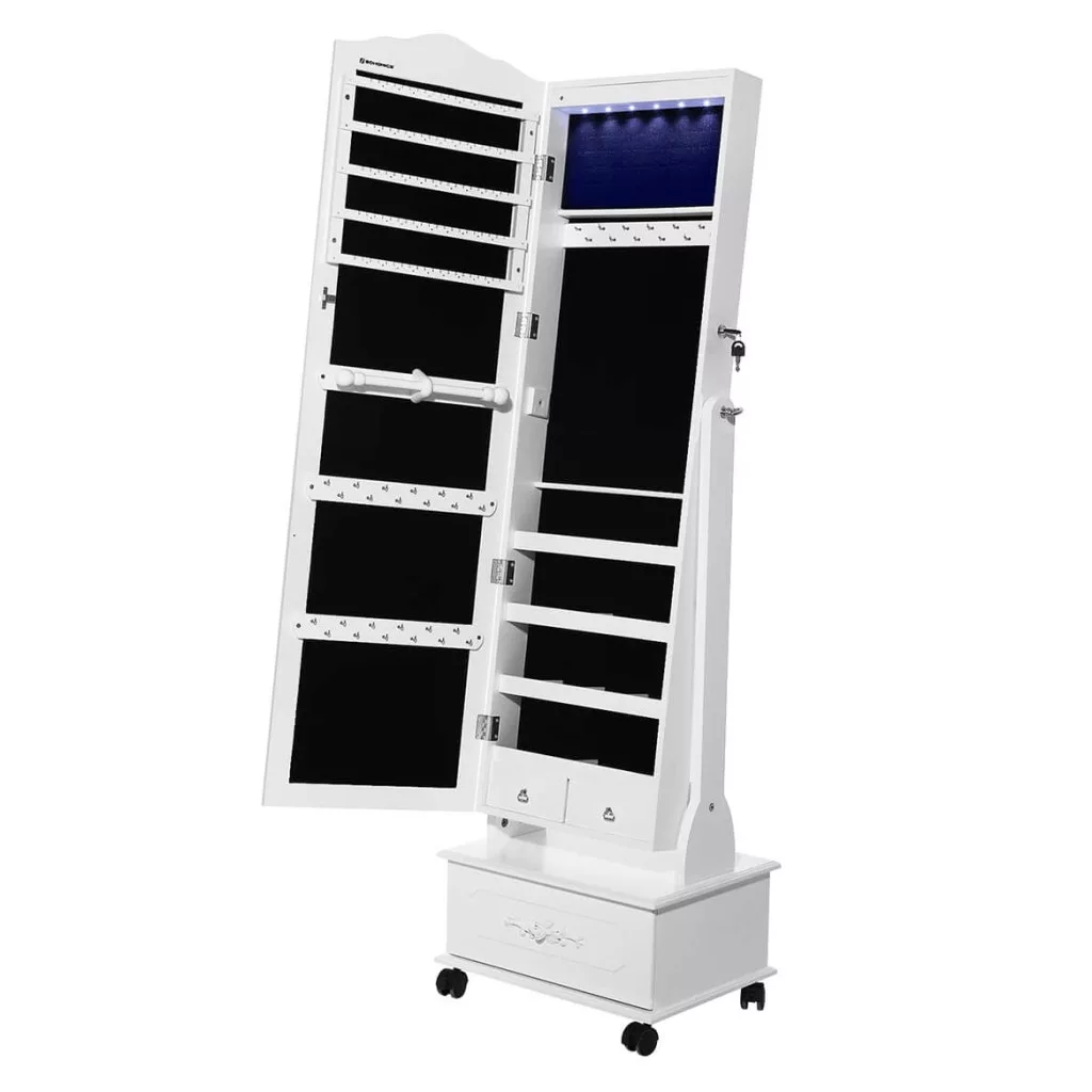 Álló ékszeres szekrény, kerekekkel, LED világítással, zárható, fehér 45x35x156cm