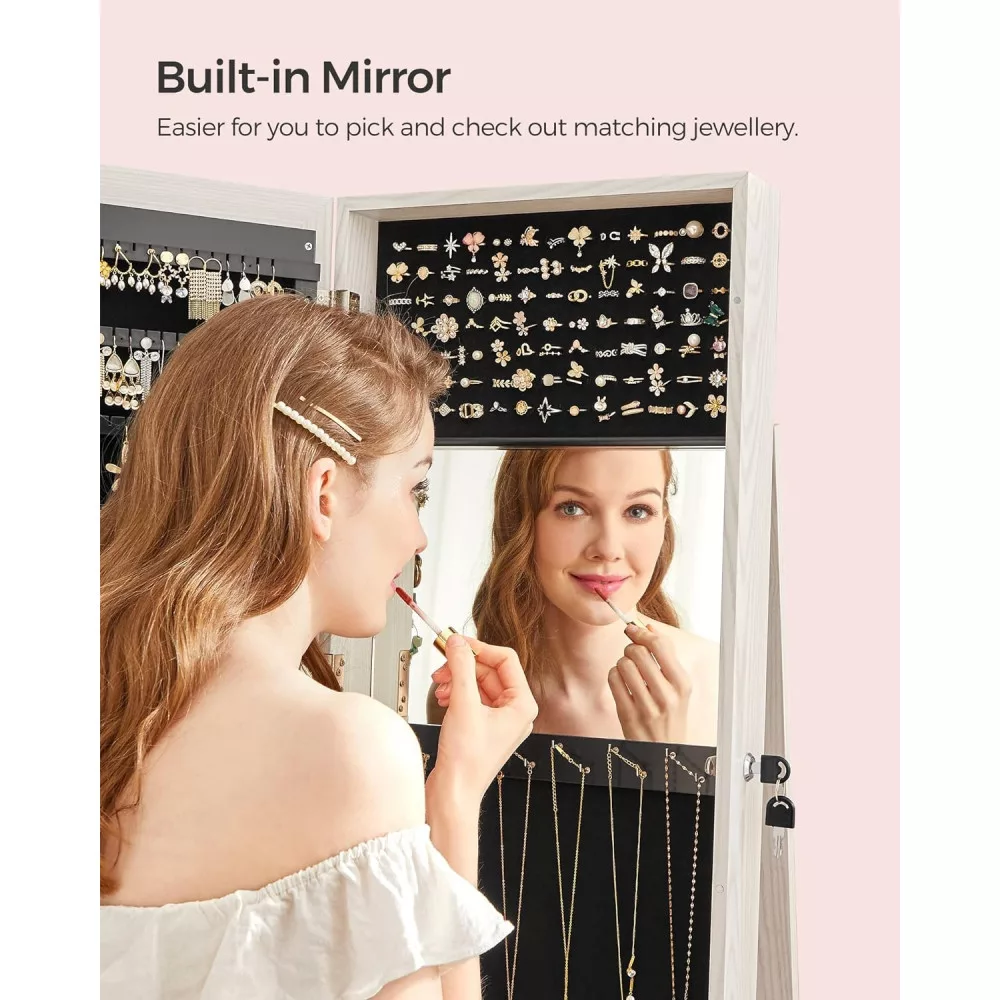 SONGMICS Álló ékszeres szekrény, tükörrel, polcokkal, zárható, fehér 162x55x55cm