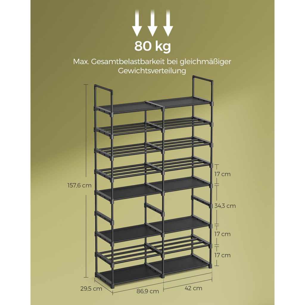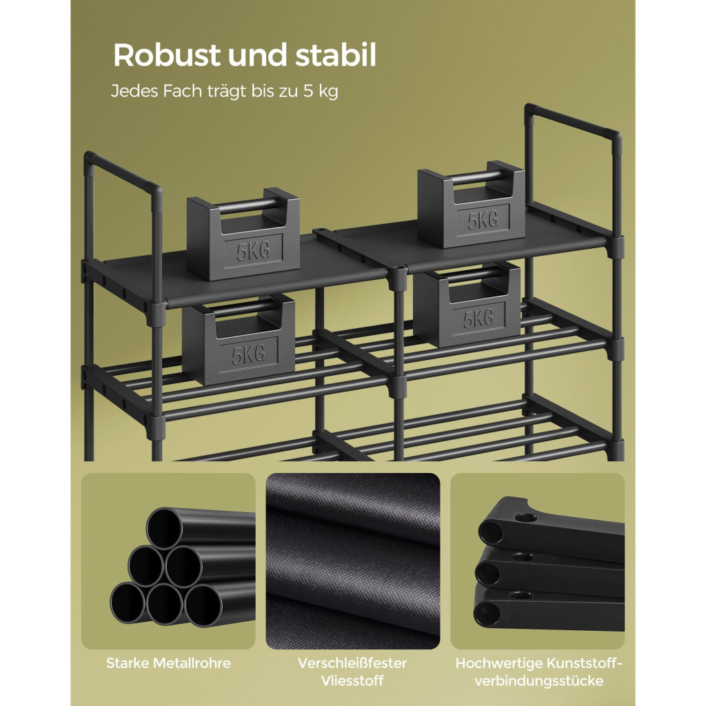 Masszív és stabil: Kiváló minőségű acélcsövekből és kopásálló nem szőtt anyagból készült, ez a tartós cipőtartó rekeszenként akár 5 kg-ot is elbír. A mellékelt dőlésgátló készlet biztosítja, hogy az állvány stabil maradjon és ne inogjon.