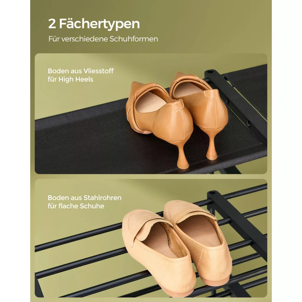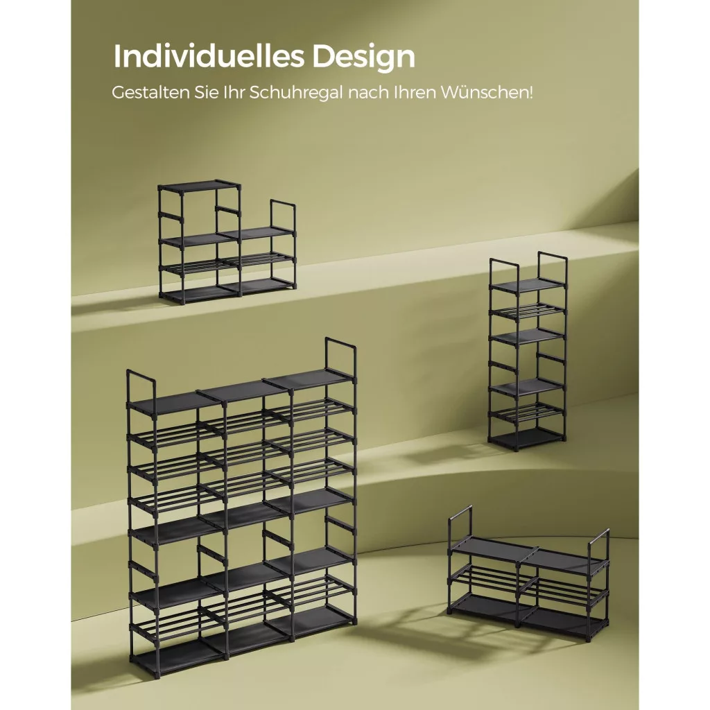 Testreszabható kialakítás: Állítsa be a cipőtartó elrendezését az elemek magasságának megfelelően. Akár 2 vagy több állványra is szétosztható. Igazítsa egyedi tárolási igényeihez, legyen az egy szekrényben, garázsban vagy tárolóhelyiségben!