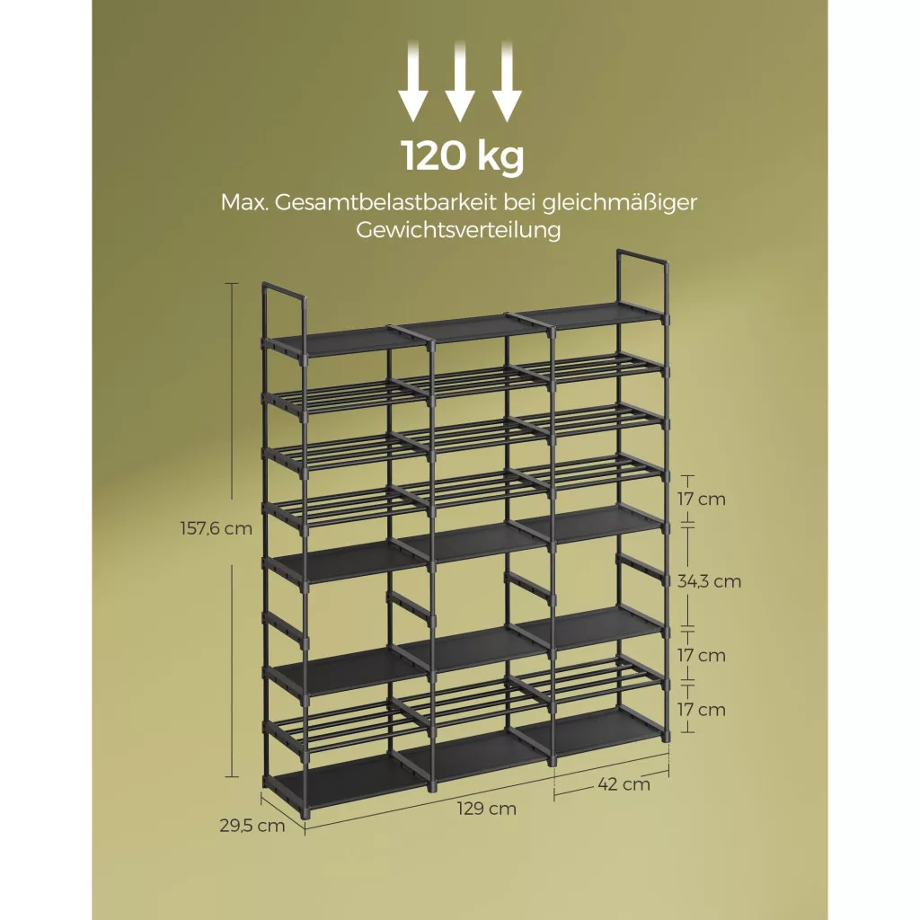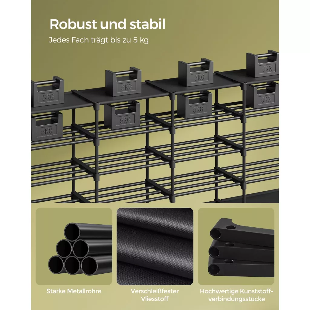 Masszív és stabil: Kiváló minőségű acélcsövekből és kopásálló nem szőtt anyagból készült, ez a tartós cipőtartó rekeszenként akár 5 kg-ot is elbír. A mellékelt dőlésgátló készlet biztosítja, hogy az állvány stabil maradjon és ne inogjon.