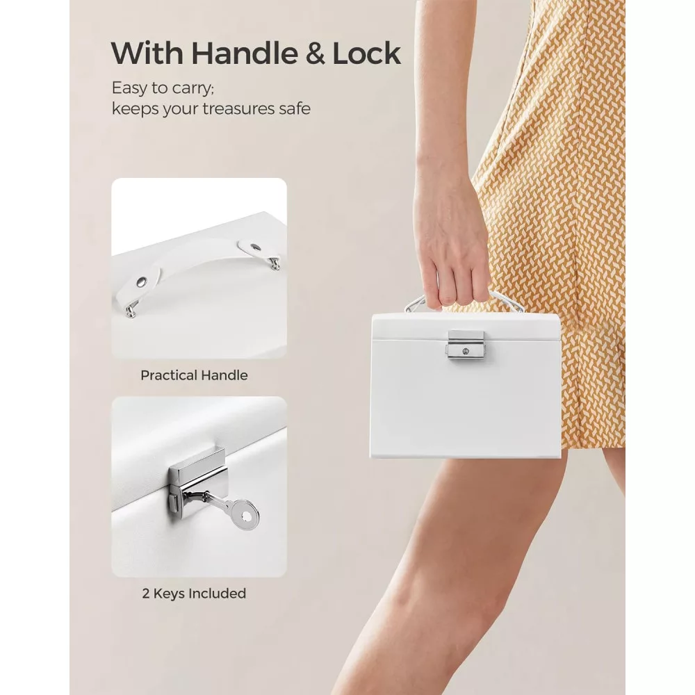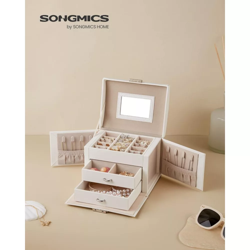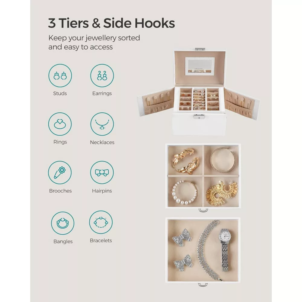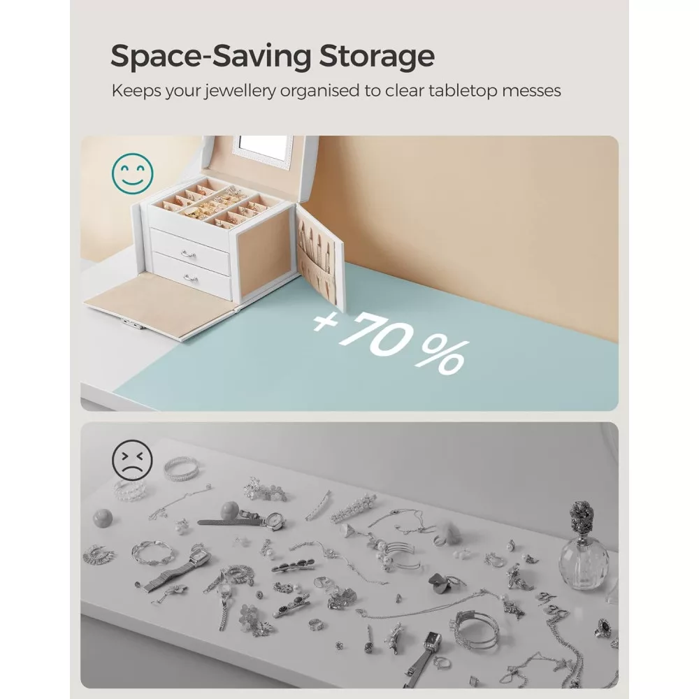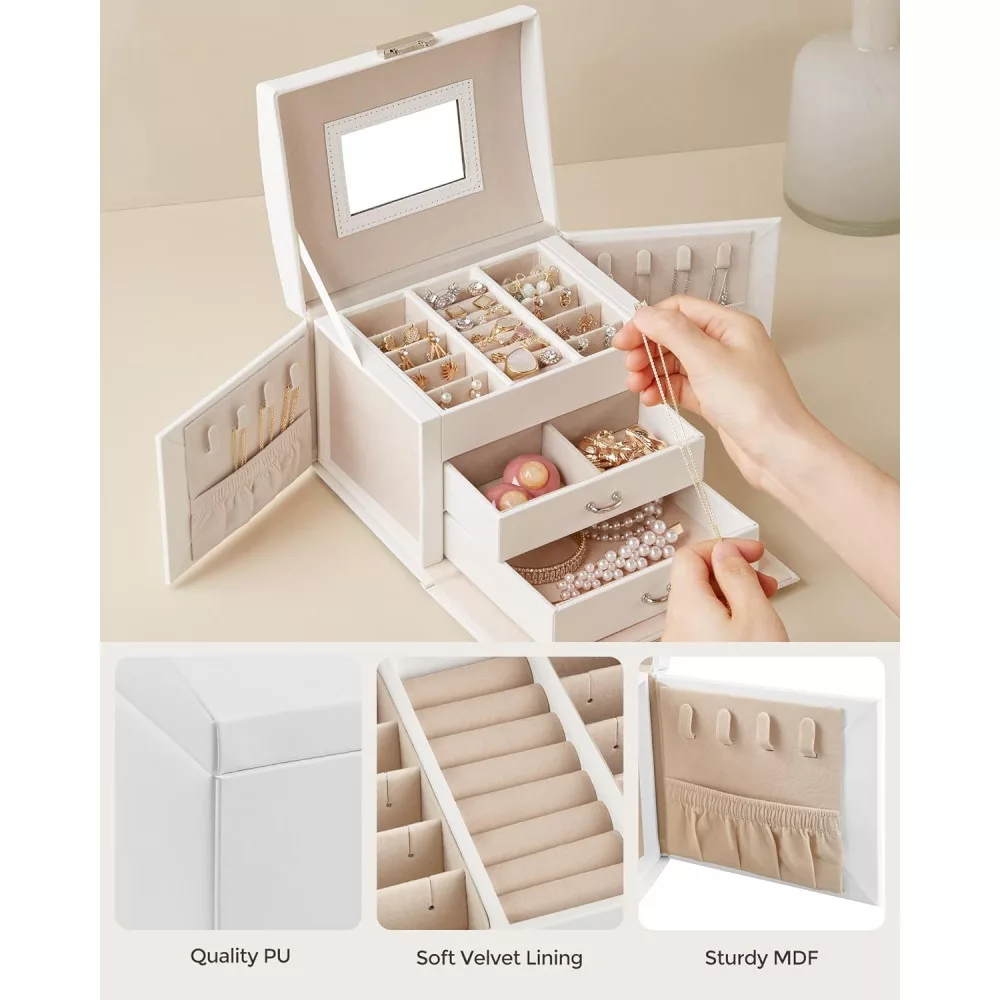 Teljes a különböző ékszerekhez: Belül fiókok, kivehető elválasztók, nyílások, lyukak, kampók és zsebek találhatók—minden, amire szükséged van az ékszereid tárolásához! Mi más? 1 tükör, hogy gyönyörködhess a szépségedben