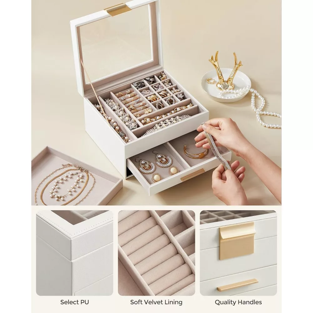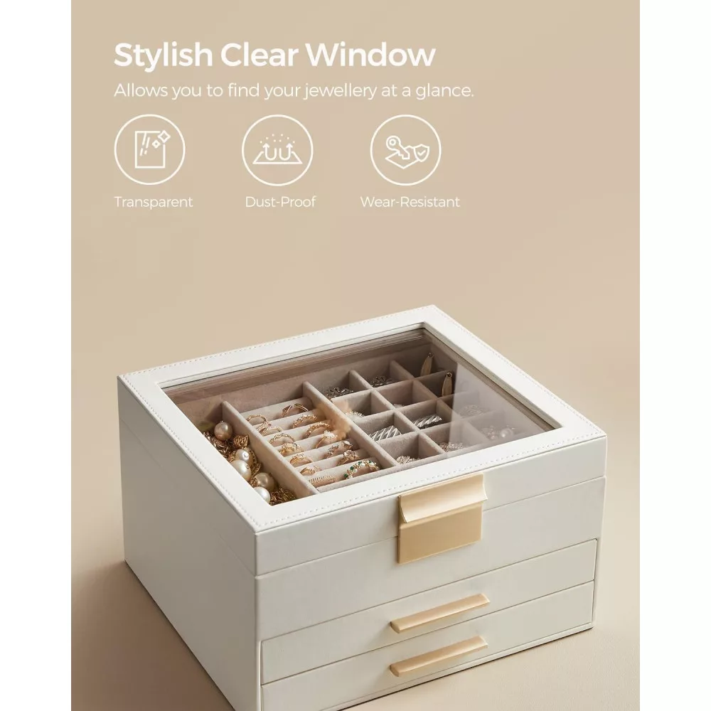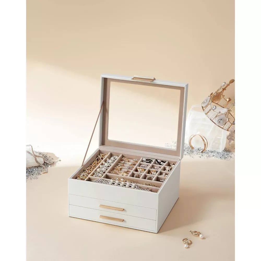 SONGMICS Ékszerdoboz üvegfedéllel, 3 rétegű ékszerrendező 2 fiókkal, ékszertároló,