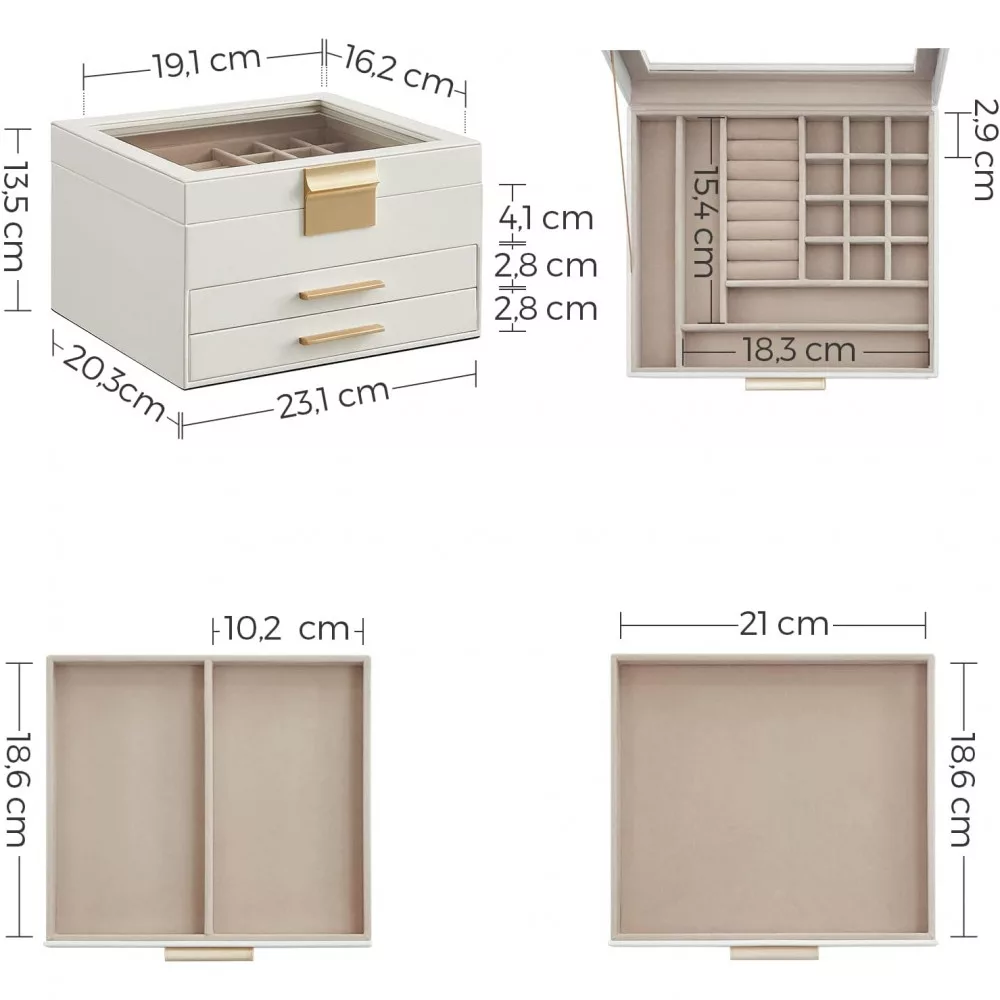 SONGMICS Ékszertartó doboz üvegfedéllel, 2 fiókkal, fehér 23x20x13cm