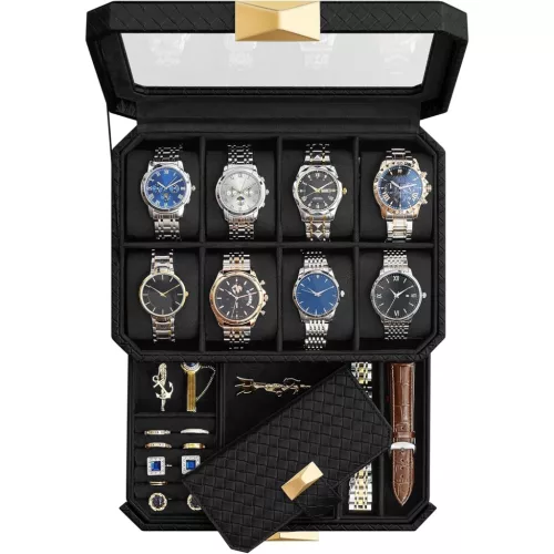 Két réteg, sokoldalú tárolás: Tartsd az óráidat a 8 férőhelyes felső rétegben, amely minden méretű órának megfelel, és rendezd kiegészítőidet típus szerint a különböző rekeszekkel ellátott fiókban. Időmérők, gyűrűk, brossok, óraszíjak és még sok más – mindennek megvan a helye