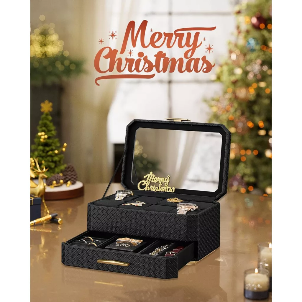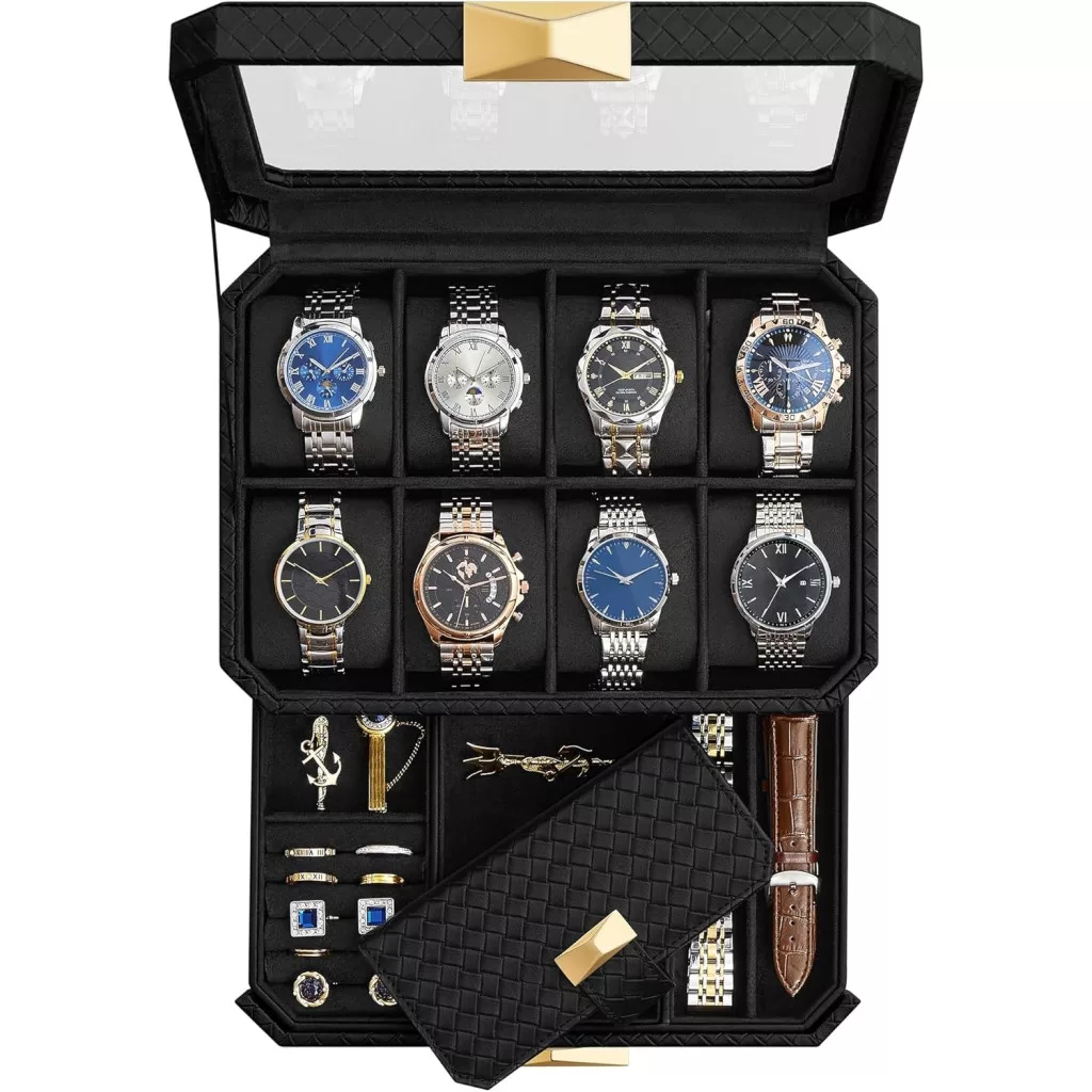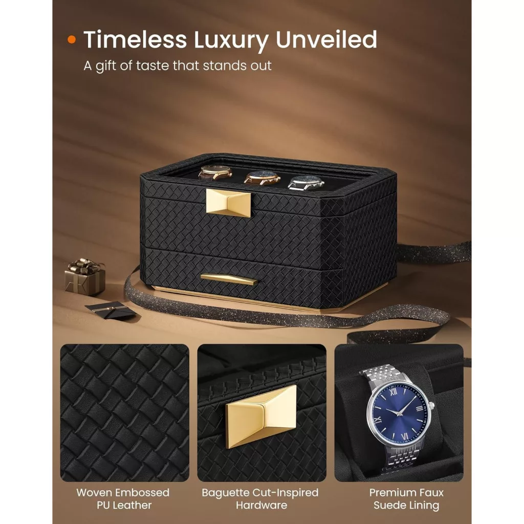 Songmics SONGMICS HOME RONNE Kollekció - 2 szintes óratartó doboz fiókkal, 8 férőhelyes óratok utazó óratartó tasakkal, szövött mintás PU bőr, lebegő hatás, karácsonyi ajándék, tintafekete UJWB025B01