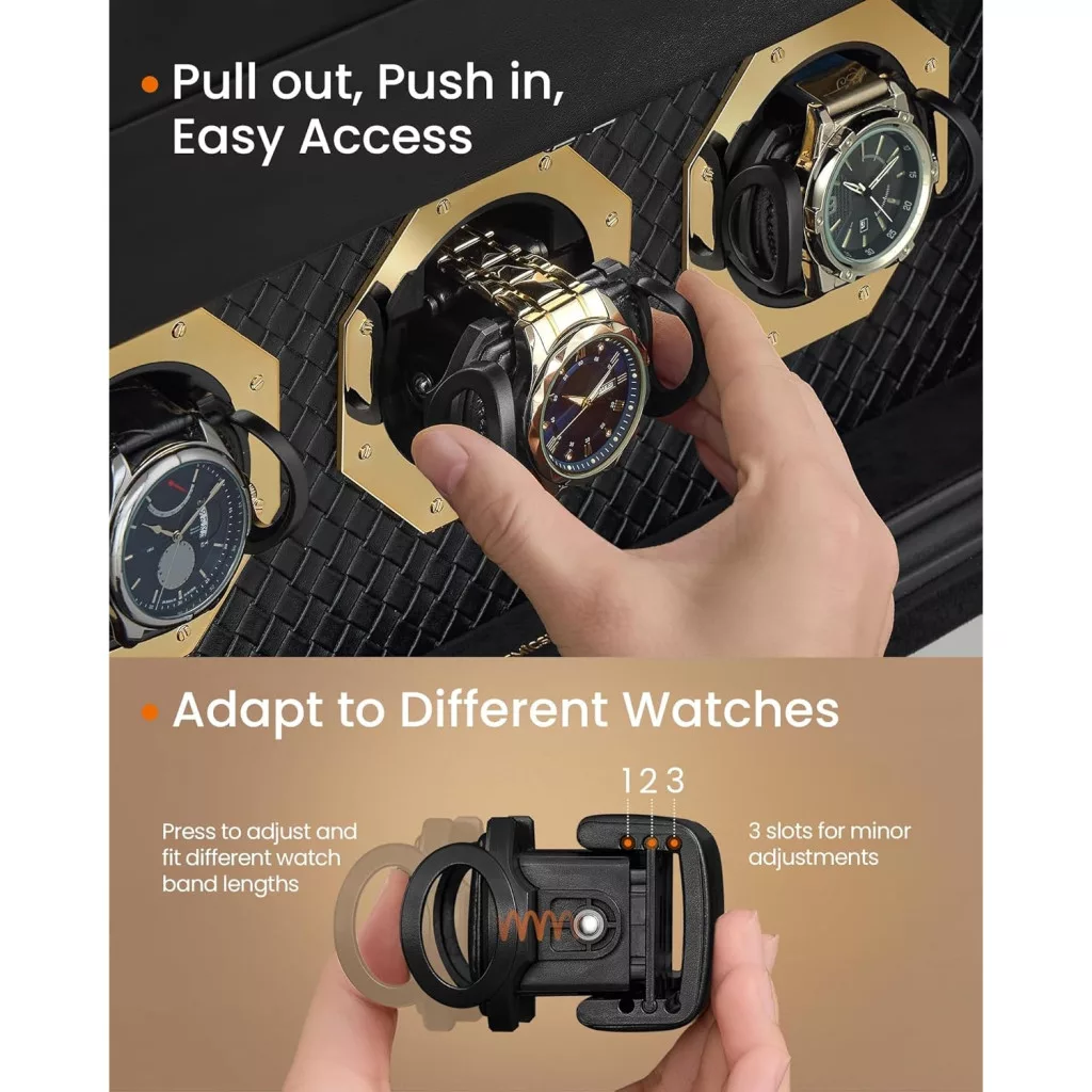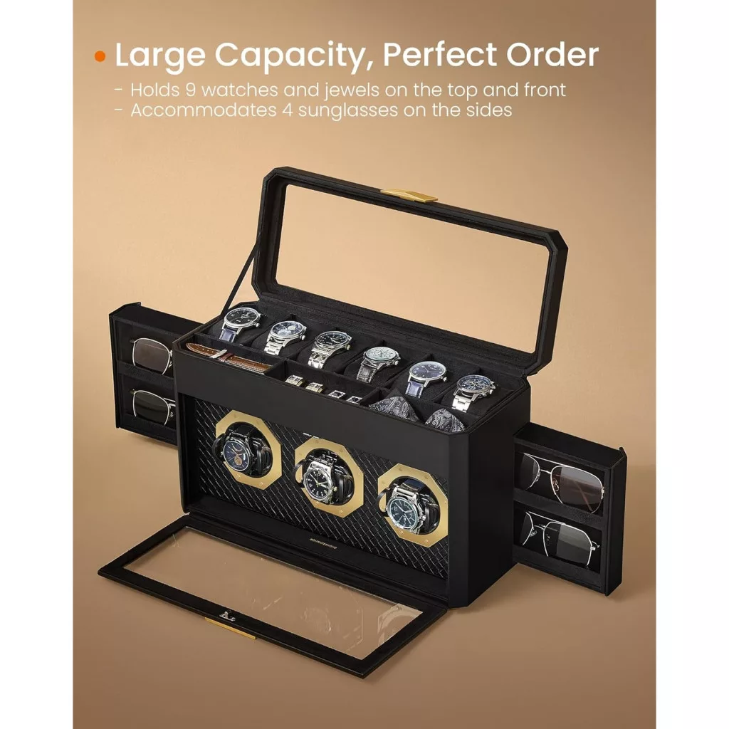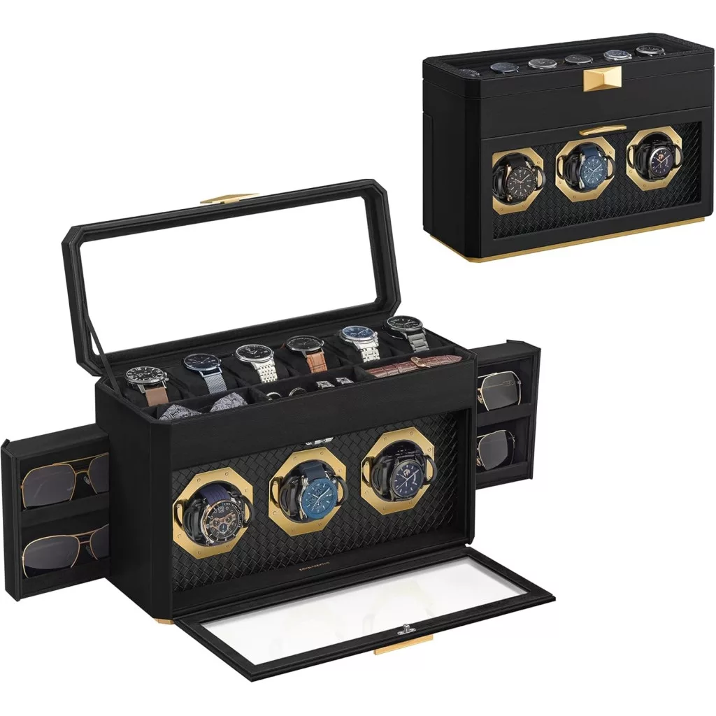 Minden egyben tárolás: 6 tágas férőhellyel és 3 állítható tartóval büszkélkedve ez az óra szervező 9 különböző méretű órát tart. Húzd ki az oldalsó fiókokat 4 napszemüveg számára, és használd a felső rekeszeket gyűrűk, óraszíjak és egyebek tárolására—egy megoldás mindenre