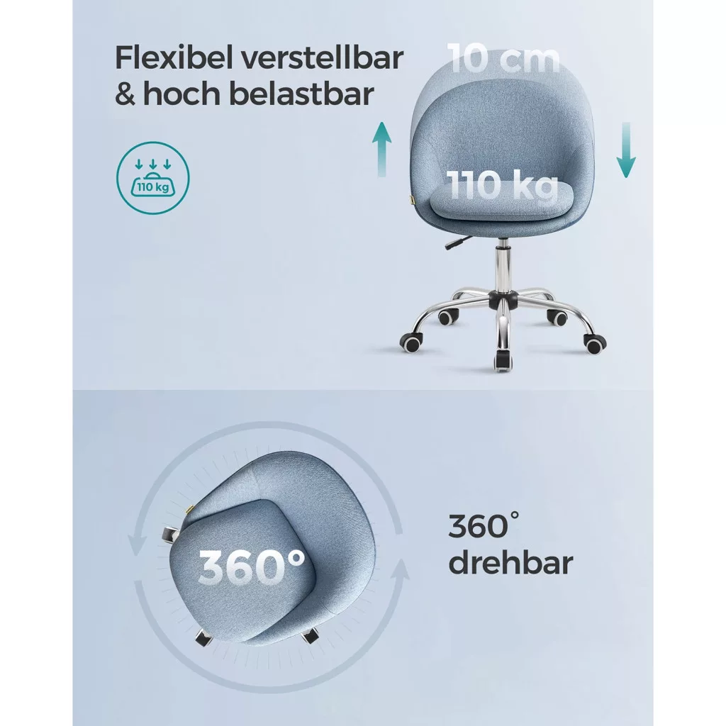 Helytakarékos: Ez a kompakt, 360°-ban forgatható íróasztali szék (60 x 60 cm) 10 cm-rel állítható magasságú és nincs karfája. Ha nincs használatban, a széket az asztal alá tolhatja, hogy helyet takarítson meg.