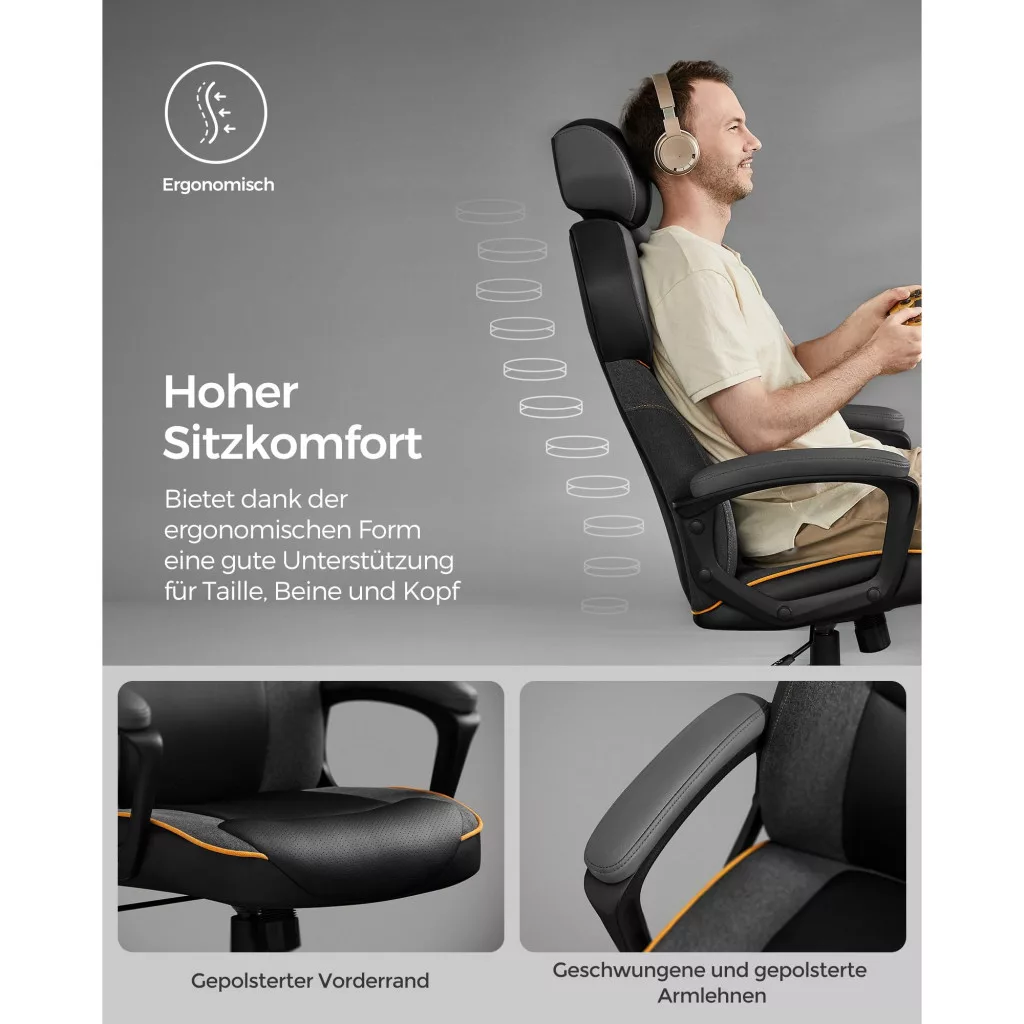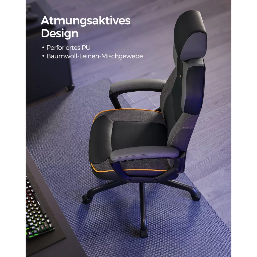 Stílusos megjelenés: A versenyautó üléséből inspirálva, a fekete PU és pamut-len keverék anyag narancssárga vonalakkal kombinálva sportos érzést kölcsönöz, és nagyon alkalmas a játék- vagy tanulószobádba