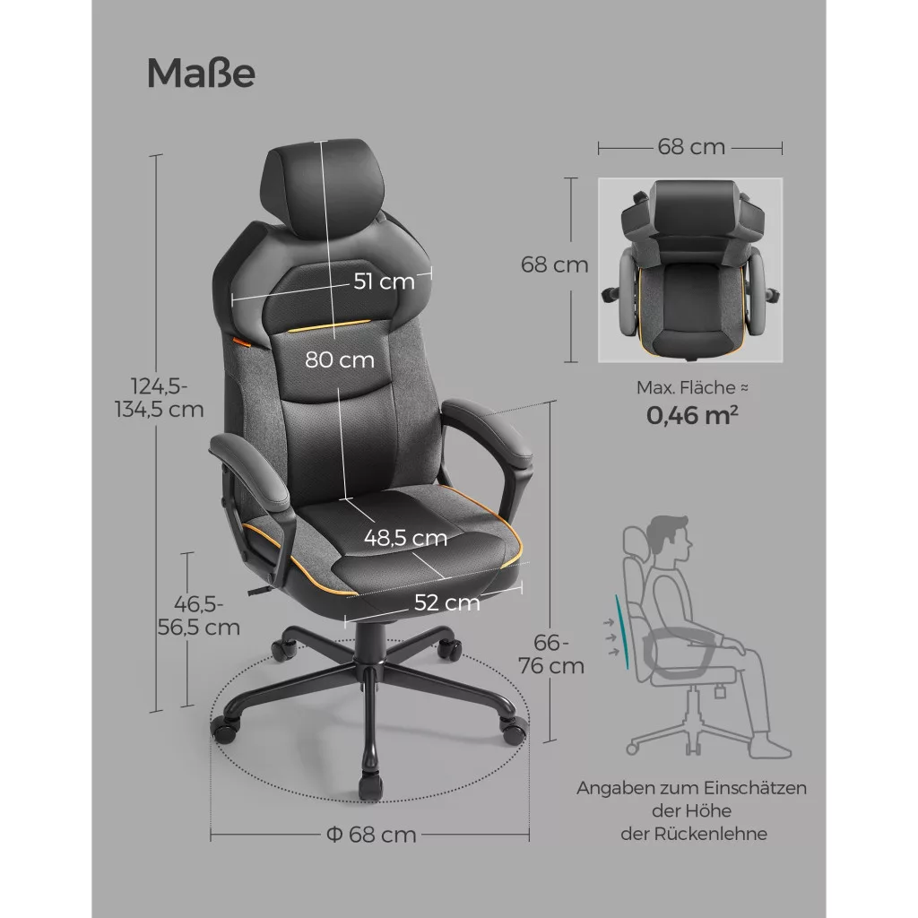 Több helyen állítható: Az ülés magassága 46,5-56,5 cm között állítható; az állítható fejtámla optimális támogatást nyújt a nyaknak és a fejnek, 170-190 cm magas felhasználók számára alkalmas; 95-110°-os döntési funkció a pihenéshez