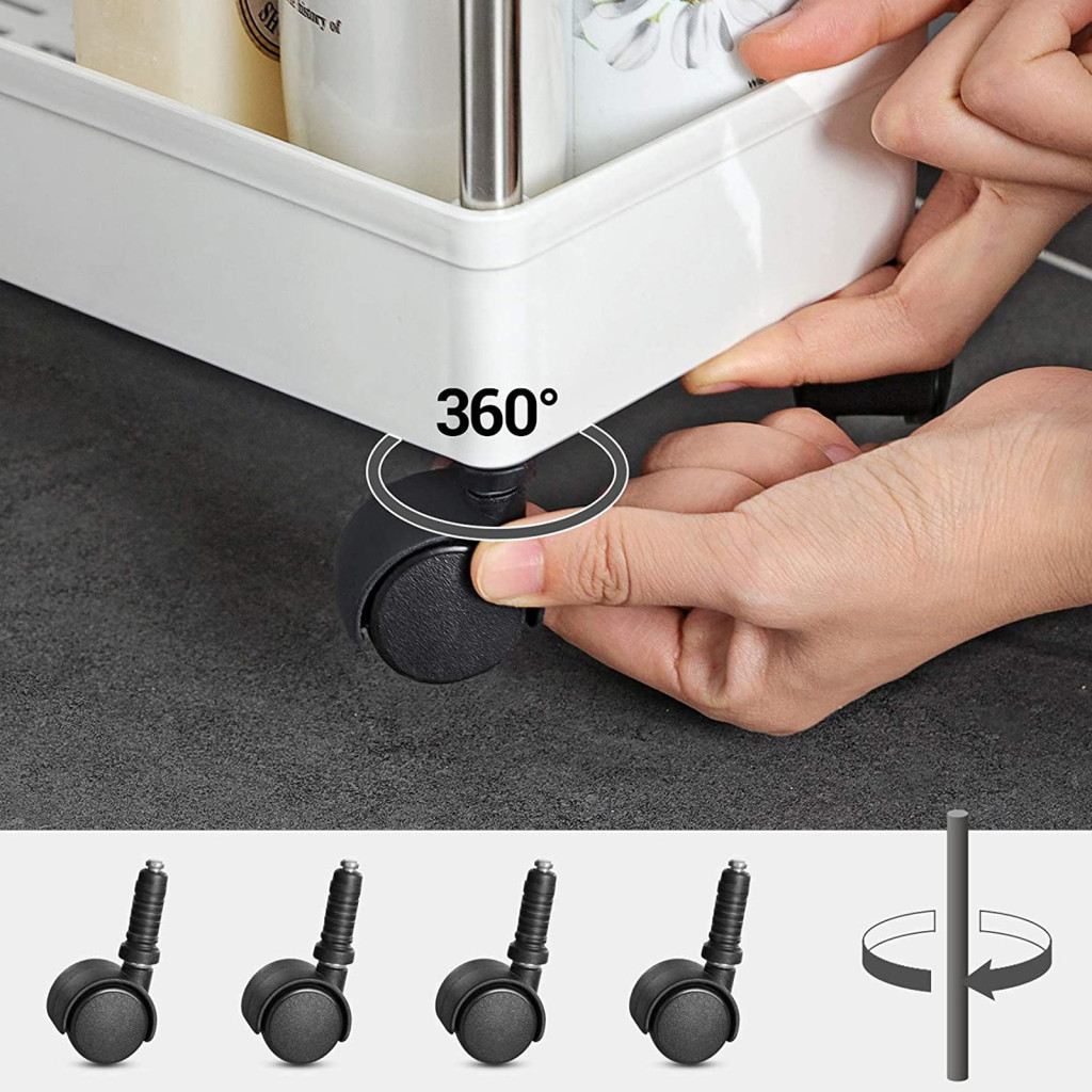 Könnyen mozgatható kerekekkel: A 4 sima forgókeréknek köszönhetően a kocsit bárhová mozgathatja, ahol szüksége van rá, kihasználva a sarokteret a fűszeres üvegek vagy fürdőszobai kellékek rendszerezésére.
