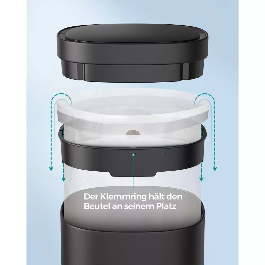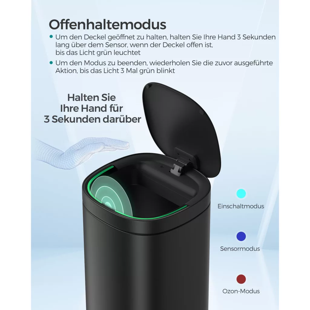 Mozgásérzékelő: Csak intsen a kezével 25 cm-en belül az érzékelő fölött, és a fedél automatikusan kinyílik 0,3 másodpercen belül, kényelmes megoldást kínálva, amely megszabadítja Önt a szemetes érintésétől. A fedél automatikusan bezáródik 5 másodperccel a kinyitás után.