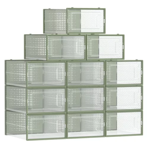 Amit kapsz: 12 darab átlátszó cipősdoboz csomag átlátszó elülső ajtóval, halmozható és összecsukható kialakítással, szellőzőnyílásokkal. Mondj búcsút a szétszórt cipőknek, és tedd rendbe a cipőidet most!