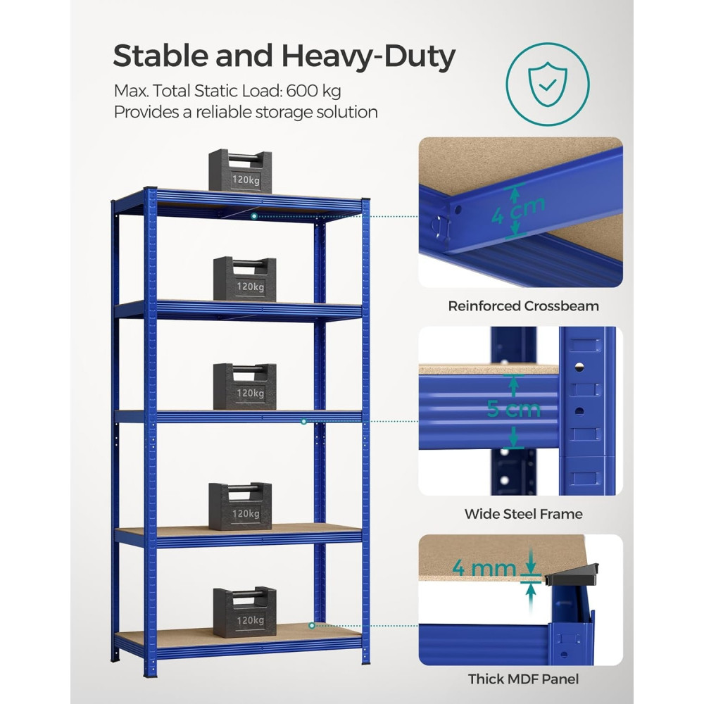 Nagy méret, nagy kapacitás: 50 x 100 x 200 cm méretű és összesen 600 kg teherbírású polcrendszer, amely használható garázsban, raktárban, pincében vagy háztartási helyiségben, hogy rendszerezze az összes szerszámát és felszerelését.