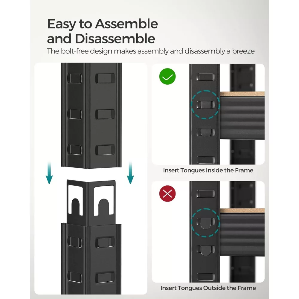 Állítható Polcok: A tároló polc összeszerelése szerszámok nélkül történik, az alkatrészek csatlakoztathatók egymáshoz beillesztős csatlakozásokkal, és a polcok közötti magasság állítható a rugalmas tárolás érdekében.