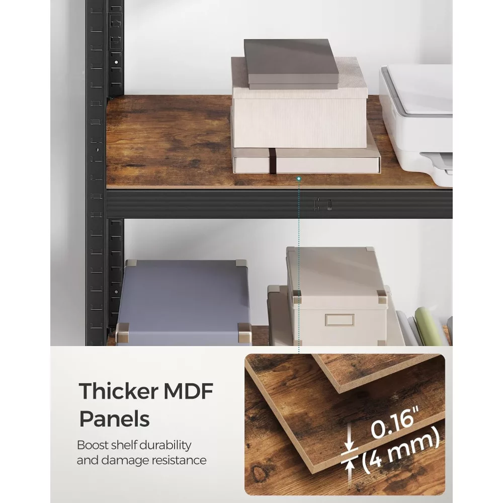 Masszív Szerkezet: A masszív forgácslap polcokat acélkeret támasztja alá további megerősítő rudakkal, minden polc akár 175 kg-ot is elbír, és biztonságosan támogatja a festékeket, szerszámokat és fitnesz felszereléseket.