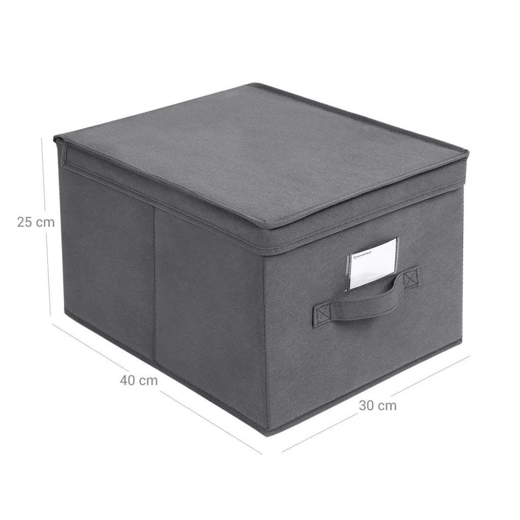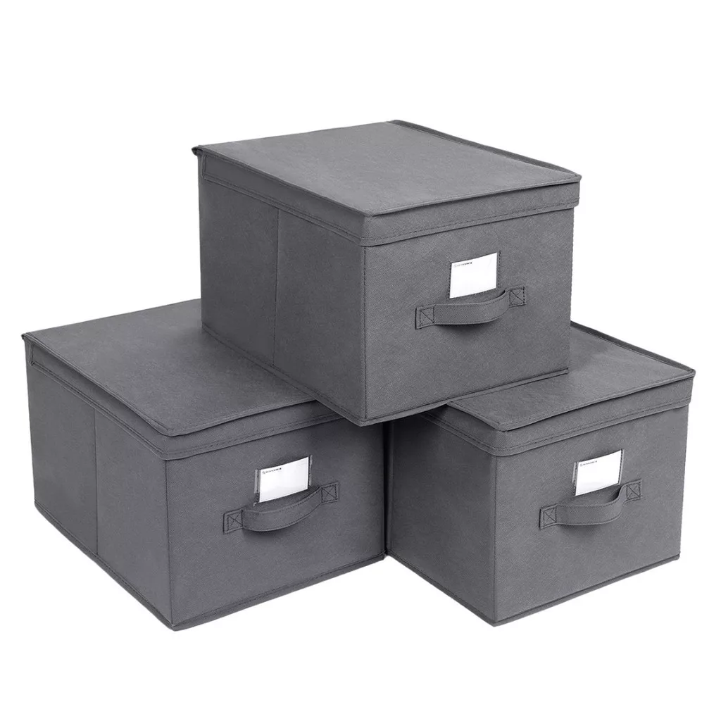Amit kapsz: 3 összehajtható tárolódobozt, rögzített fedelet a por távol tartására, elülső címketartót, varrott fogantyúkat a könnyű hordozhatóság érdekében.