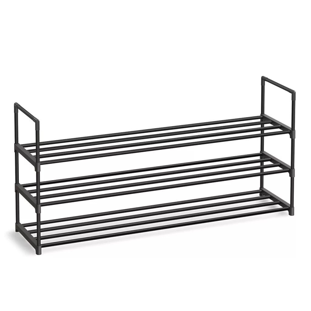 Cipőtartó polc, 3 szintes fém tároló, akár 18 pár cipőhöz, fekete 116x30x55cm