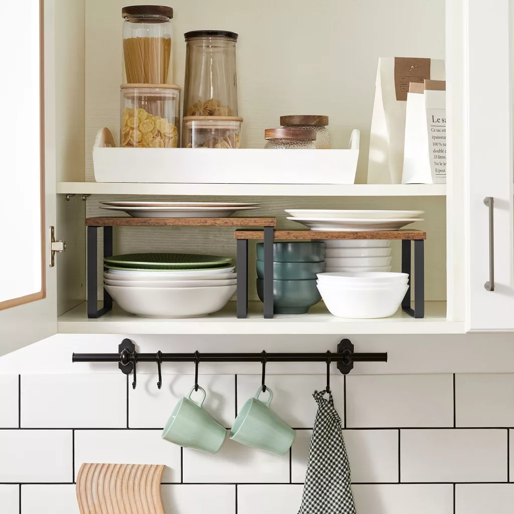 Egy prémium páros: erős, masszív fémkeretből és tartós forgácslapból készült, ez a polckészlet (minden polc akár 15 kg-ot is elbír) mindig varázslatosan rendet teremt a konyhai munkalapon.